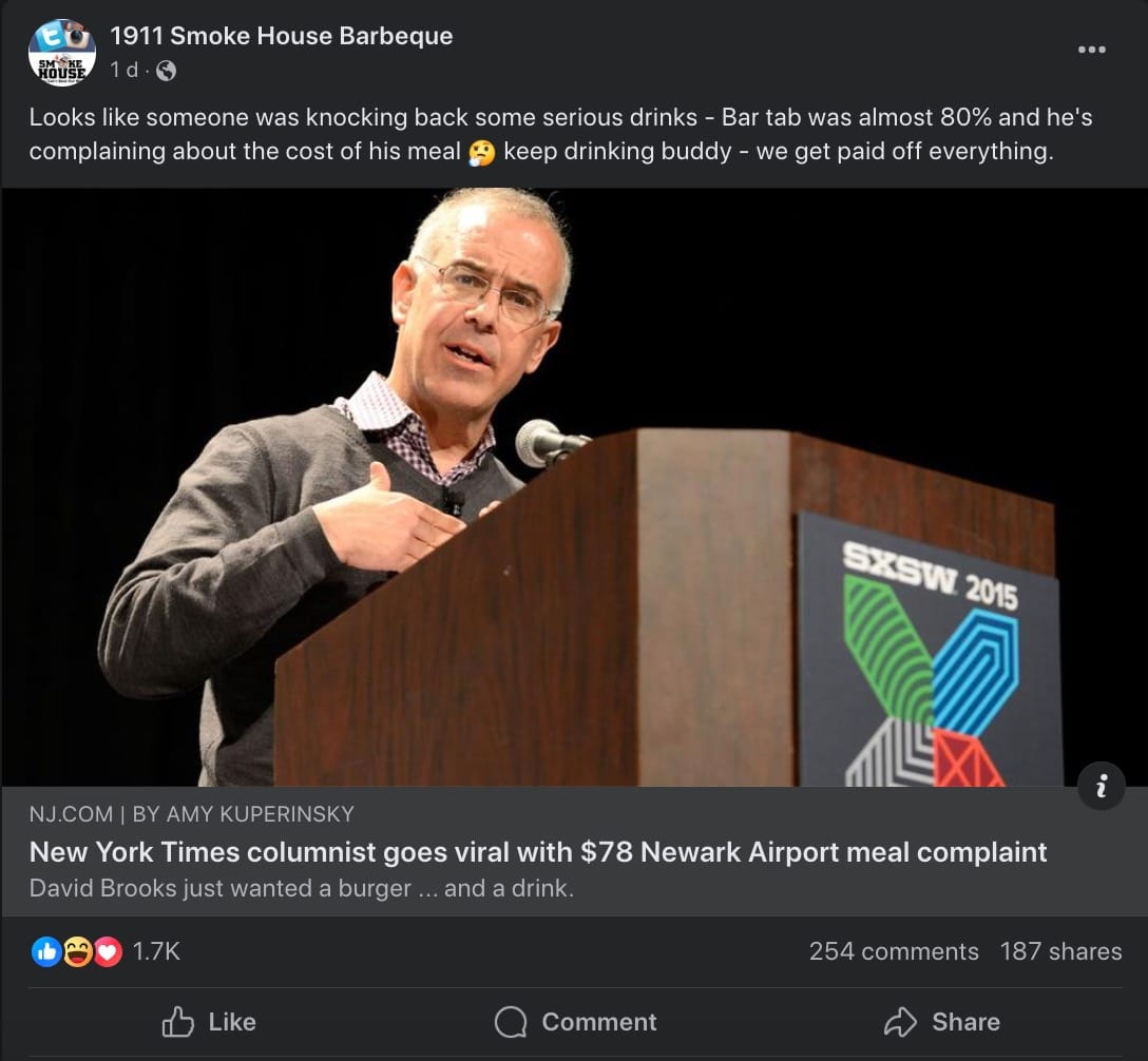 ," the New Jersey-based restaurant shared on Facebook in response to an article covering Brooks's falsified complaint. The smokehouse delivered one final blow in meme format by creating a flyer for a new "D Brooks Special," consisting of a burger, fries, and a double shot of whiskey for $17.78 — a feast in the eyes of the internet, which didn't skip a beat in calling out the columnist for his lie.