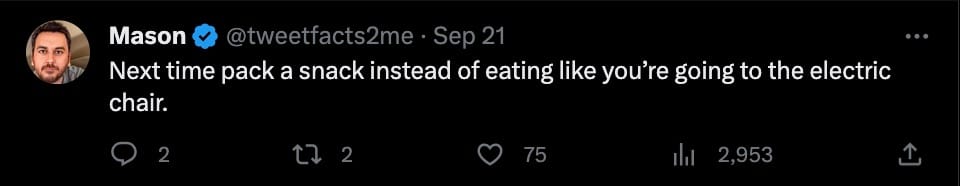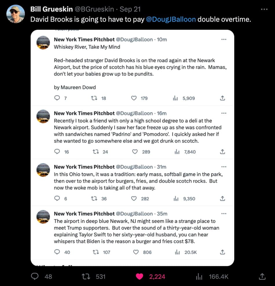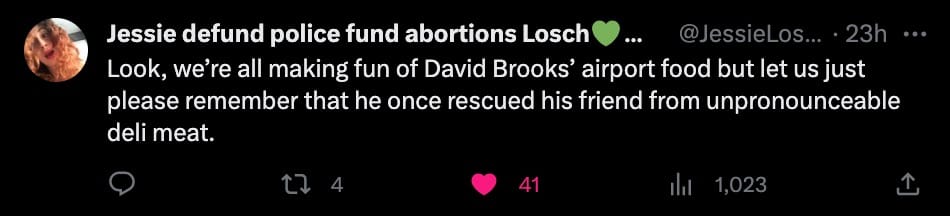 Jessie is of course referencing Brooks's harrowing tale he shared in a 2017 op-ed in which he saved one of his friends without a college education from being confronted with Italian sandwiches and deli meats, taking her to eat Mexican food instead. This anecdote has proven to be very inspirational for the New York Times Pitchbot parody account on X, as evidenced below.