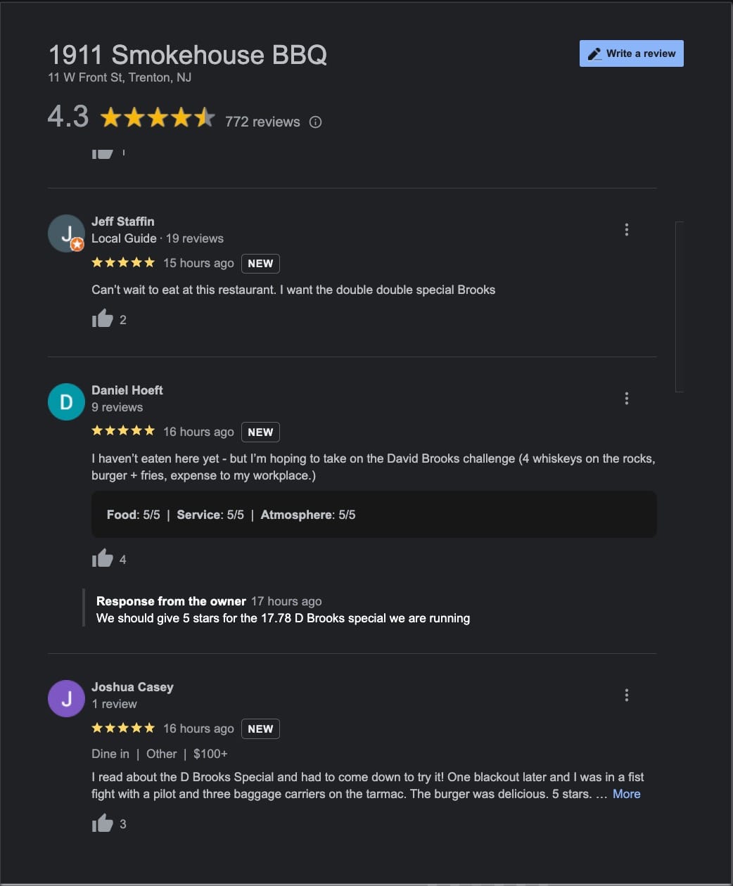 ... And as we continue to mob Brooks for this screw-up of epic proportions, the 1911 Smokehouse Barbecue is having the last laugh!