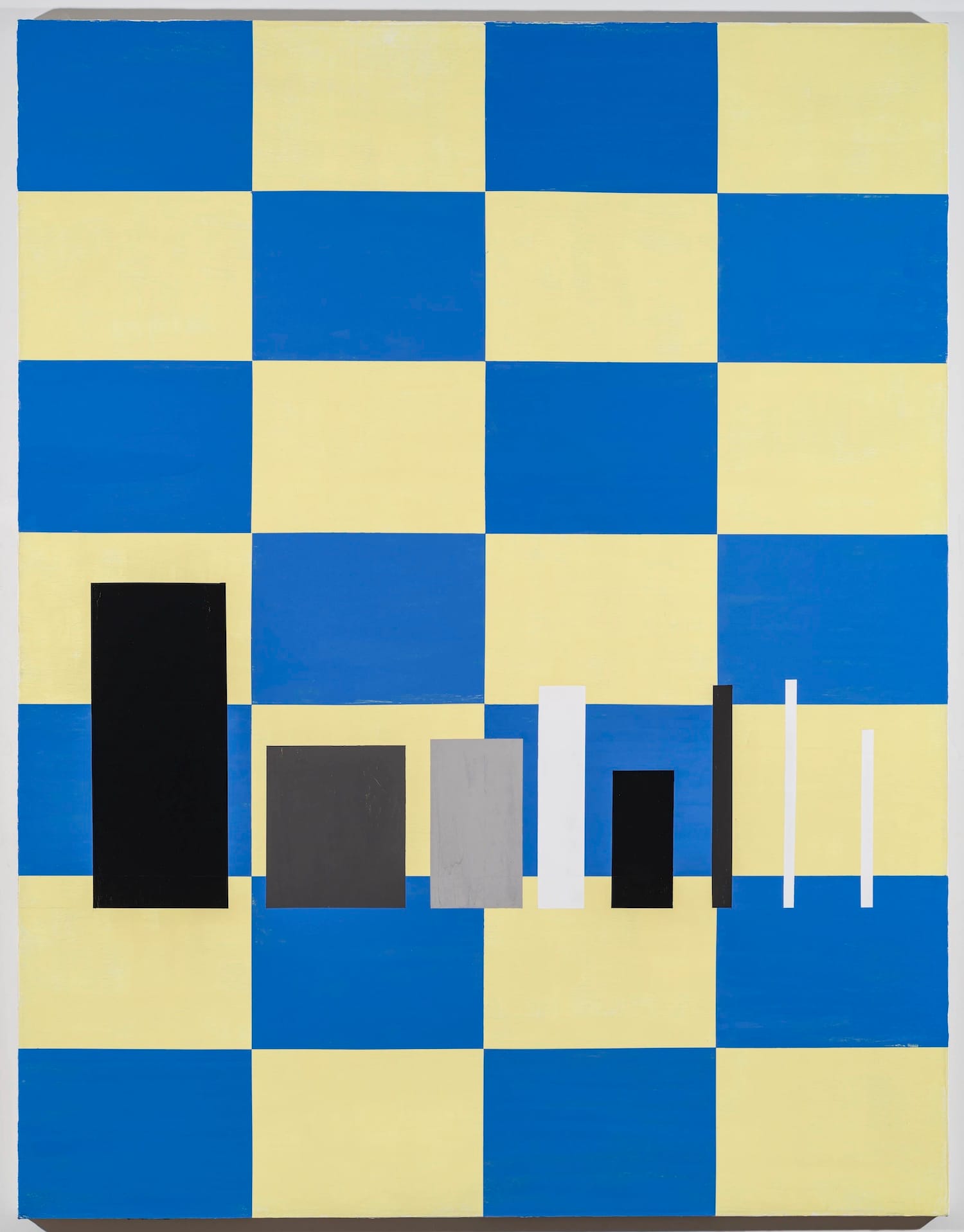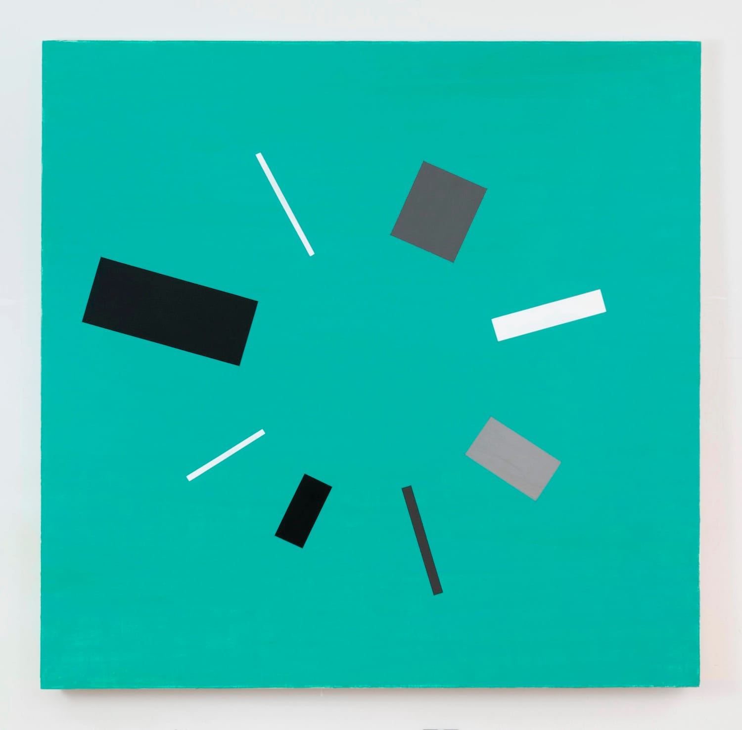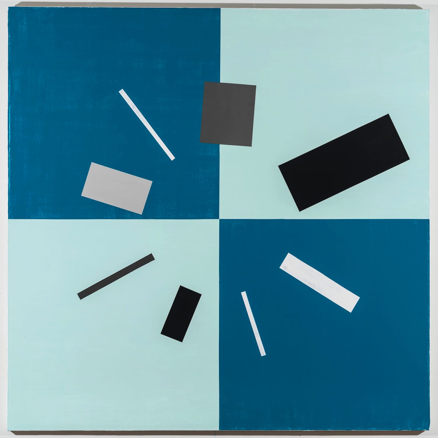 The beauty of this exhibition is how much Diao does and evokes with a limited vocabulary of eight proscribed, rectangular, black, gray, and white shapes arranged against abstract grounds that go from monochrome to checkerboard. In “Rietveld’s Berlin Chair parts forming a circle, Green” (2021), his placement of the varied rectangles invites viewers to see the circumference of the circle in their mind’s eye. This interplay between the visible and invisible is not a territory associated with geometric abstraction or conceptual painting.