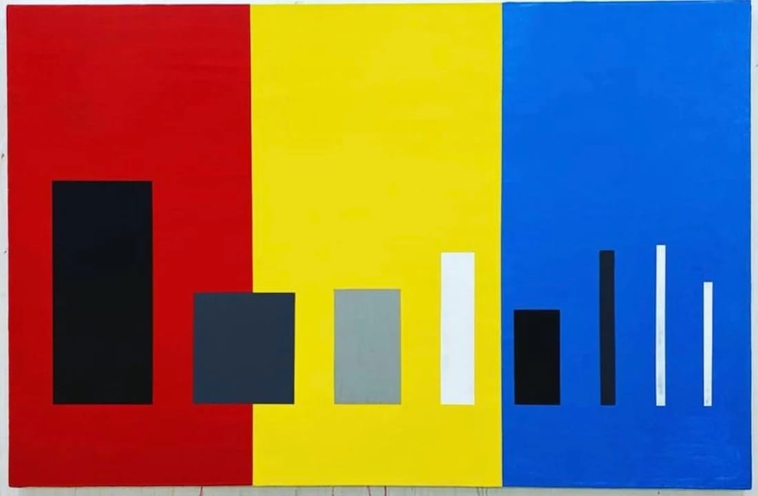 The first work that I encountered in this exhibition of 13 paintings was “Rietveld’s Berlin Chair parts on red, yellow, blue” (2021). Against a ground divided into three equal areas of red, yellow, and blue, Diao has overlaid the eight separate parts, each painted monochromatically in black, gray, and white, and aligned vertically like a column in a chart. What comes across first is the pleasure of the painting. Its surface is a tight, palpable skin of acrylic that has been laid down in layers by a palette knife. This combination of tactility, sensuality, and the non-gestural is also true of Rietveld’s chairs, as well as Barnett Newman’s collectively titled series of large paintings, Who's Afraid of Red, Yellow and Blue, in which he worked asymmetrically for the first time, and paintings made by Brice Marden in the 1970s that referred to Newman. In fact, one of the many pleasures of “Rietveld’s Berlin Chair parts on red, yellow, blue” is its combination of European and American sources, suggesting they are not as separate as many have claimed.