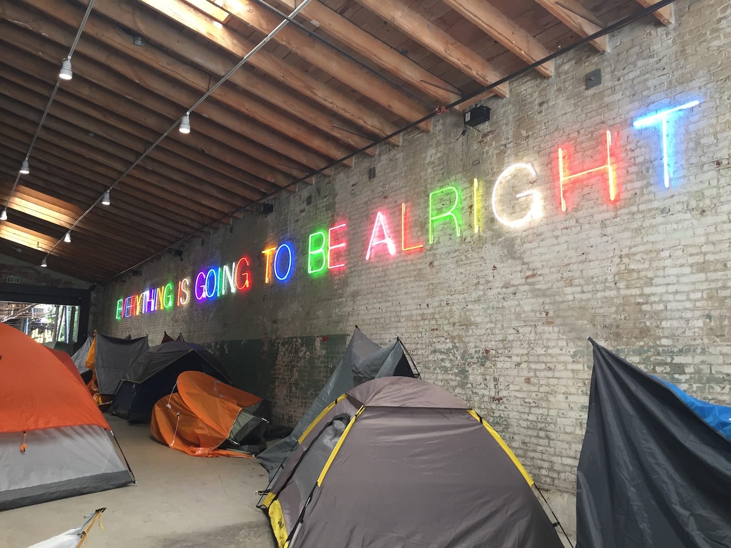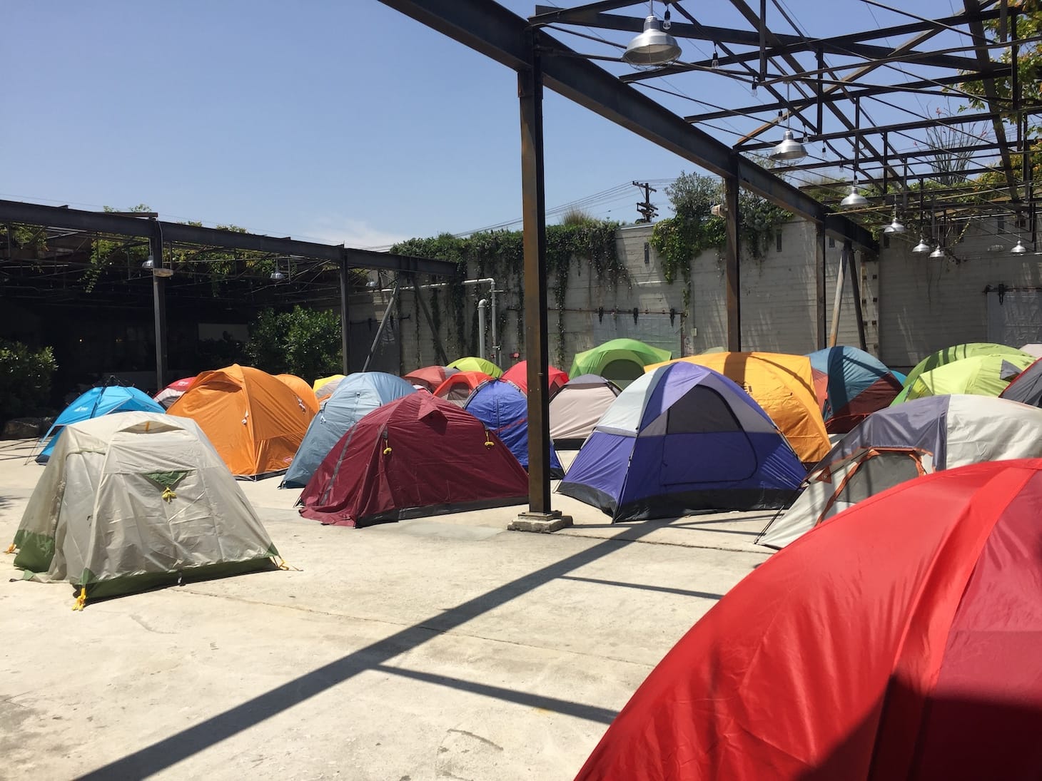 Against a backdrop of rising rents, uncontrolled development, and lack of affordable housing, the tents are a clear visual reminder of the Los Angeles housing crisis. The odd juxtaposition of jovial diners overlooking a tented ghost town implicates the viewer’s own complicity in Los Angeles’s housing failures, suggesting that the burden and responsibility for this crisis is not equally shared by all. Despite bond measures and voter-approved sales tax increases made between 2016 and 2017 to provide funds and services to reduce homelessness, the homeless population increased by 16% to over 36,000 as of June this year. Hammons’s amplification of this issue is timely, but it also speaks to systemic issues of wealth inequality that have plagued this city for generations.