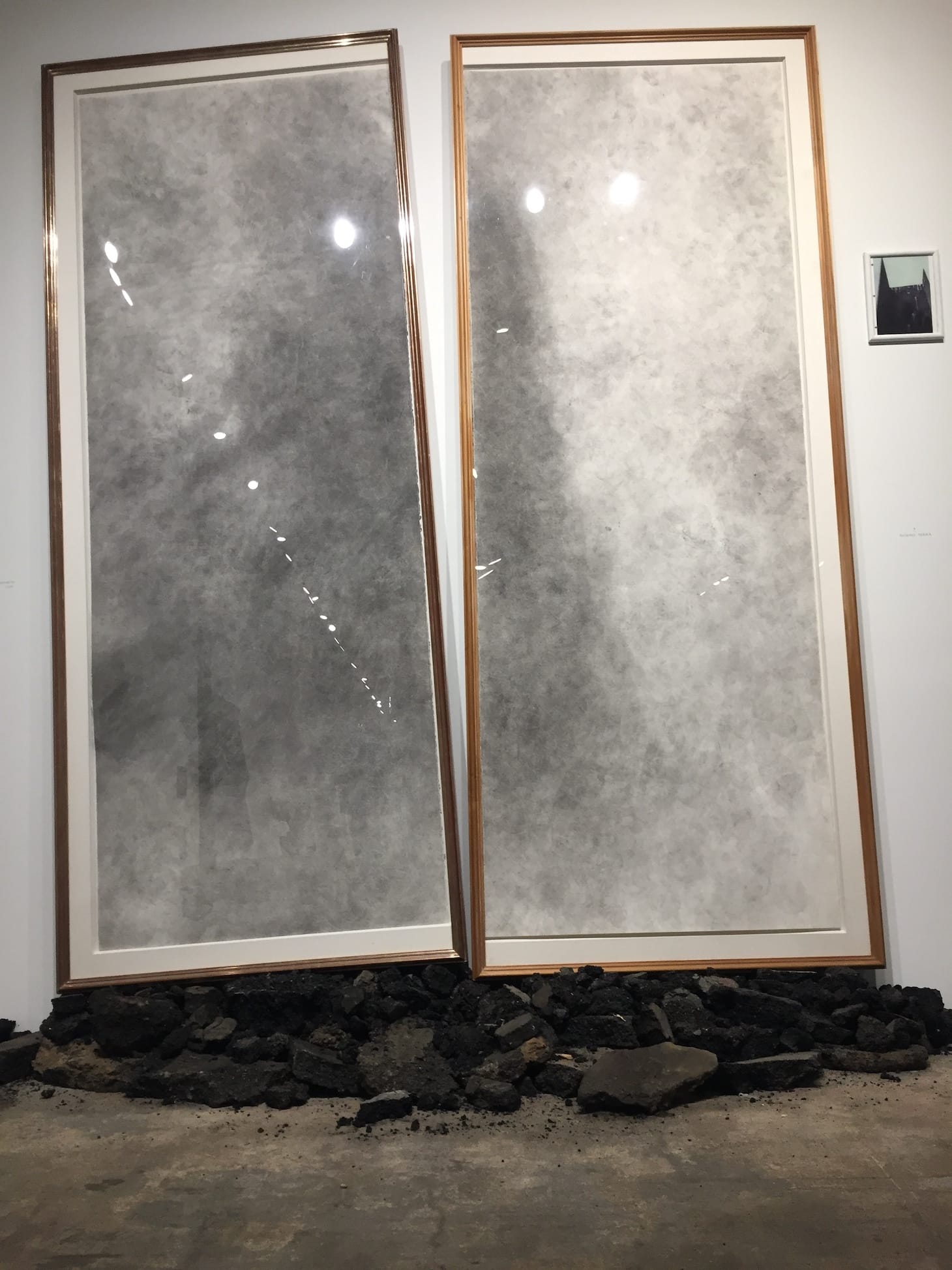 A row of framed currency of varying denominations lines two walls. Beneath these “Found Objects” Hammons lays a tempting trap for visitors in the form of crumpled dollar bills that are left on the floor below, transforming the gallery into a social experiment that exposes the primal roots of greed. Want to try to guess how many times that dollar was stolen? Ask one of the guards — according to one I asked, the money was reportedly stolen (or attempted) five times in one day.