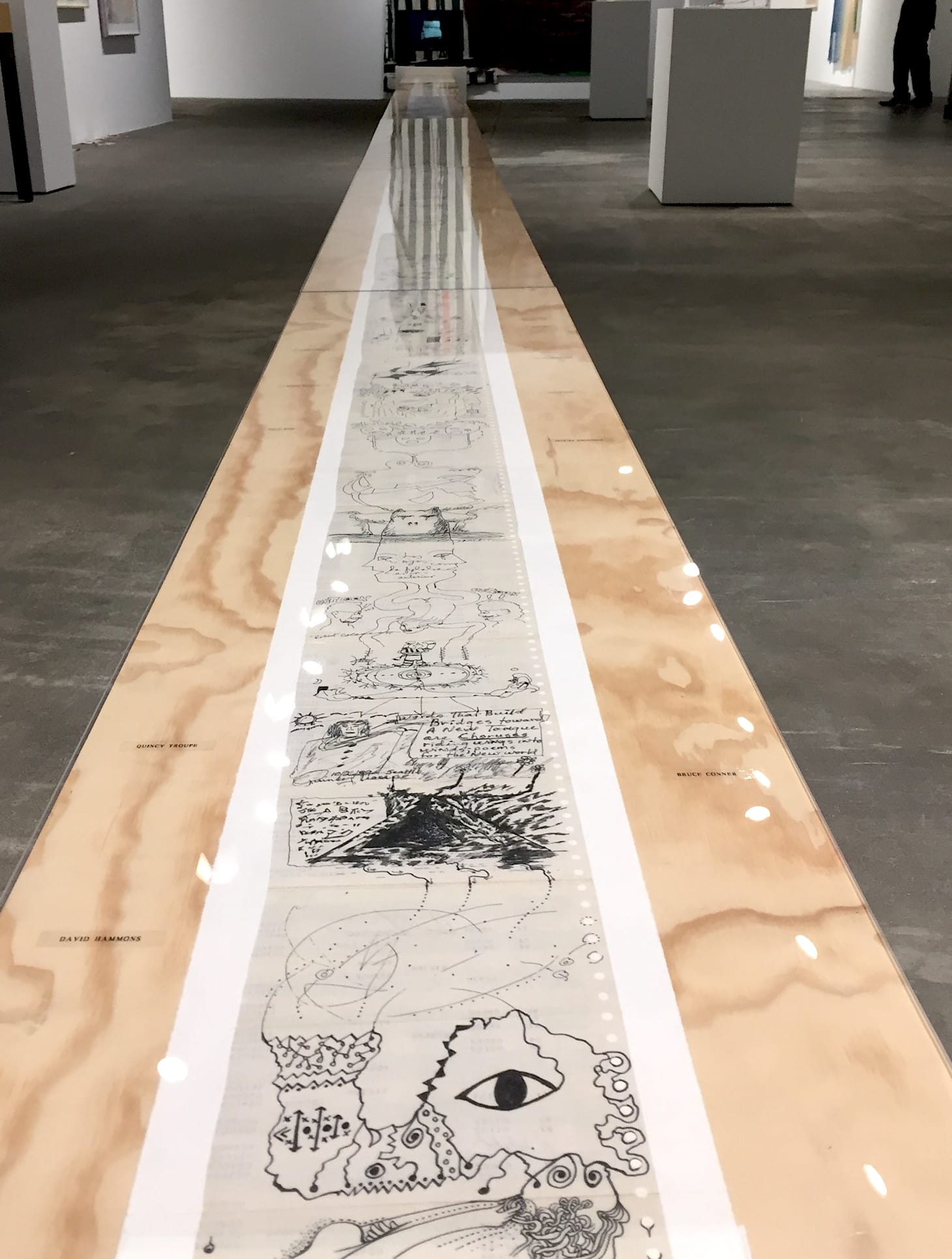 Perhaps Hammons’s most striking visual representation of Coleman’s Harmolodic Theory is his epic iteration of the Surrealist parlor game Exquisite Corpse, where one person draws an image on paper, then folds its, concealing all but a fragment of the image for the next person to continue. Without knowledge of the theme or idea that precedes it, one is free to express themselves with limited constraints.