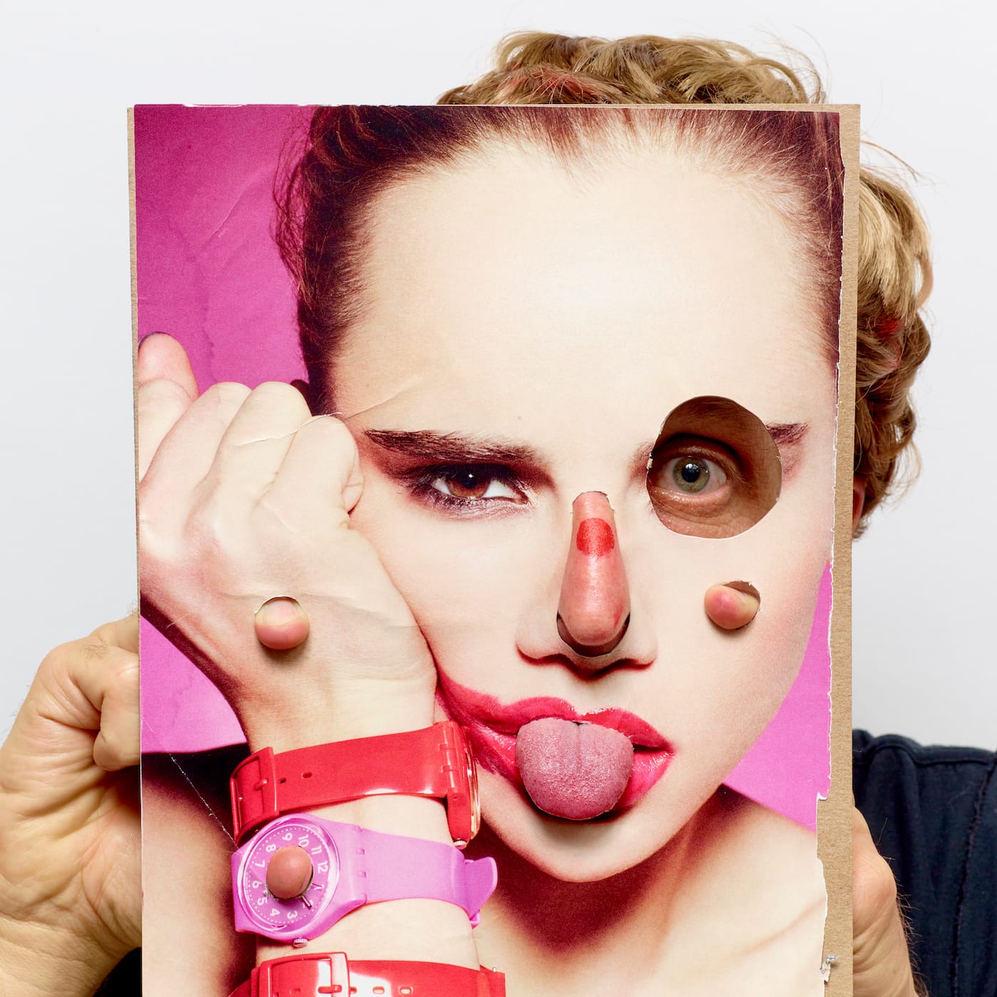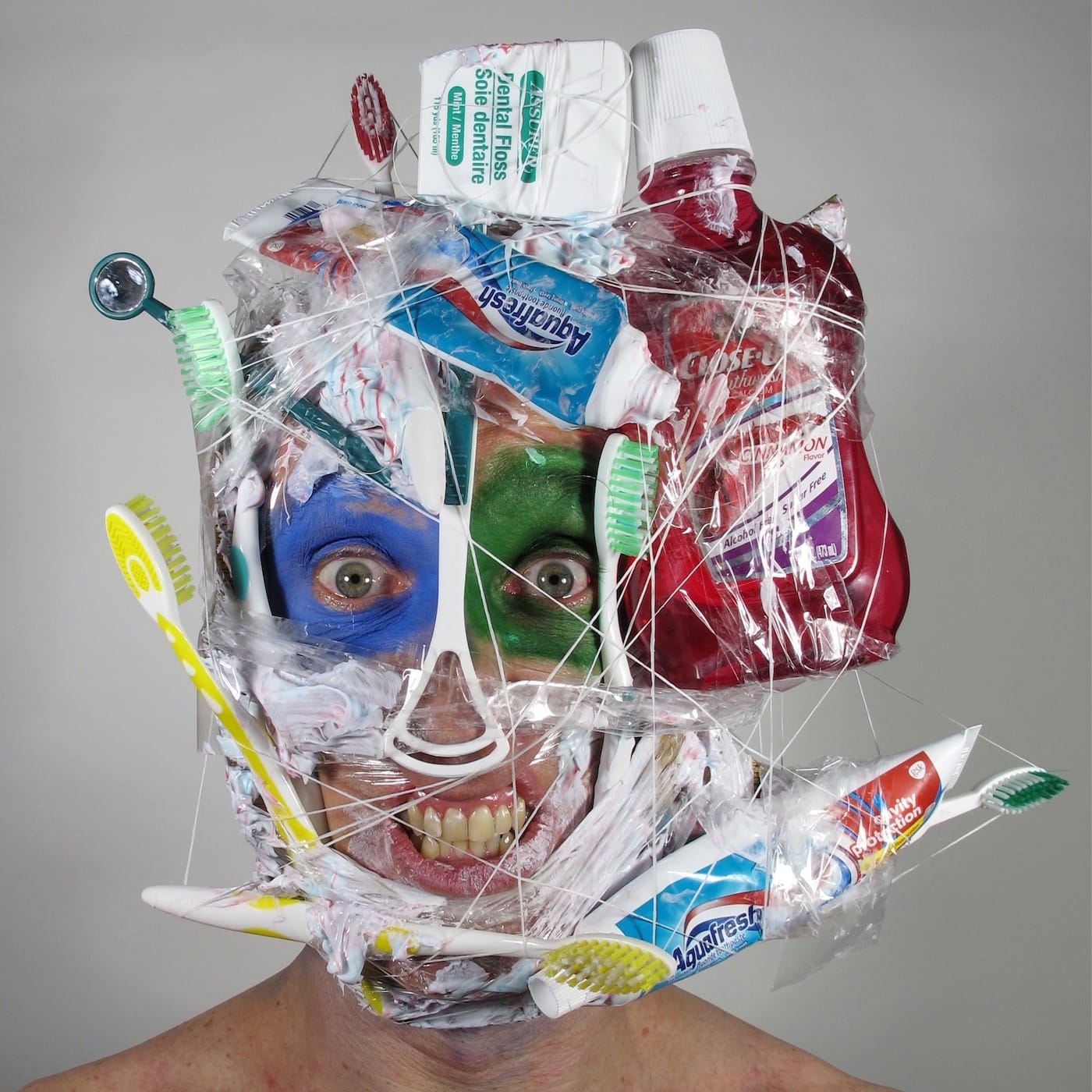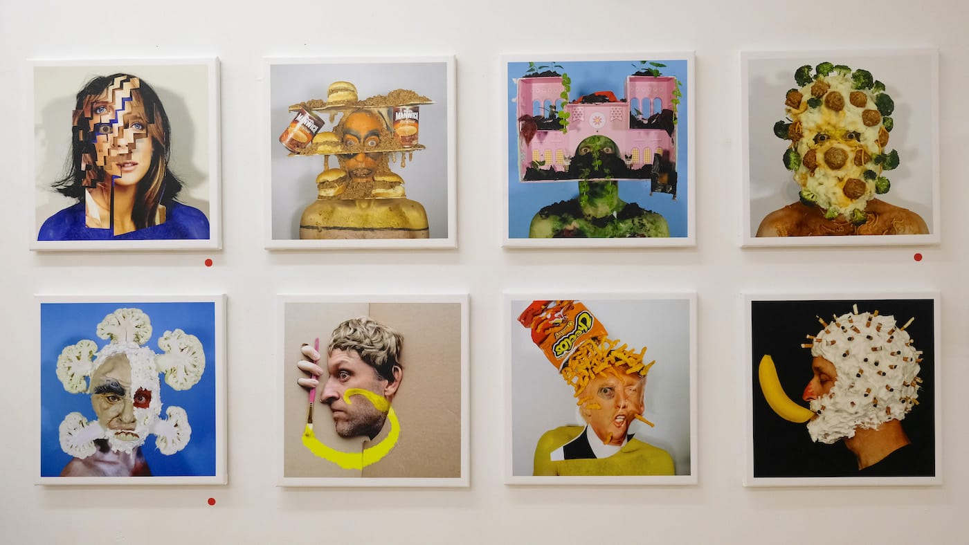 Titled Fake Smears and Facial Food Fiascos, the exhibit showcases 40 18 by 18-inch prints of David’s latest self-portraits, which were initially published on his Instagram account. Serving as a stream of consciousness, his feed is a scrapbook of what he calls “resemblage,” in which he applies props such as motorized toys, body paint, and trash to his face in complex arrangements that border on humorous and disturbing. Obscuring his identity, each one represents an ecstatic creative moment in which the artist has liberated himself psychologically and intellectually from the ways capitalism tends to dehumanize us. He presents us with a subversive, primal being who does not care about being judged or seen as weird.