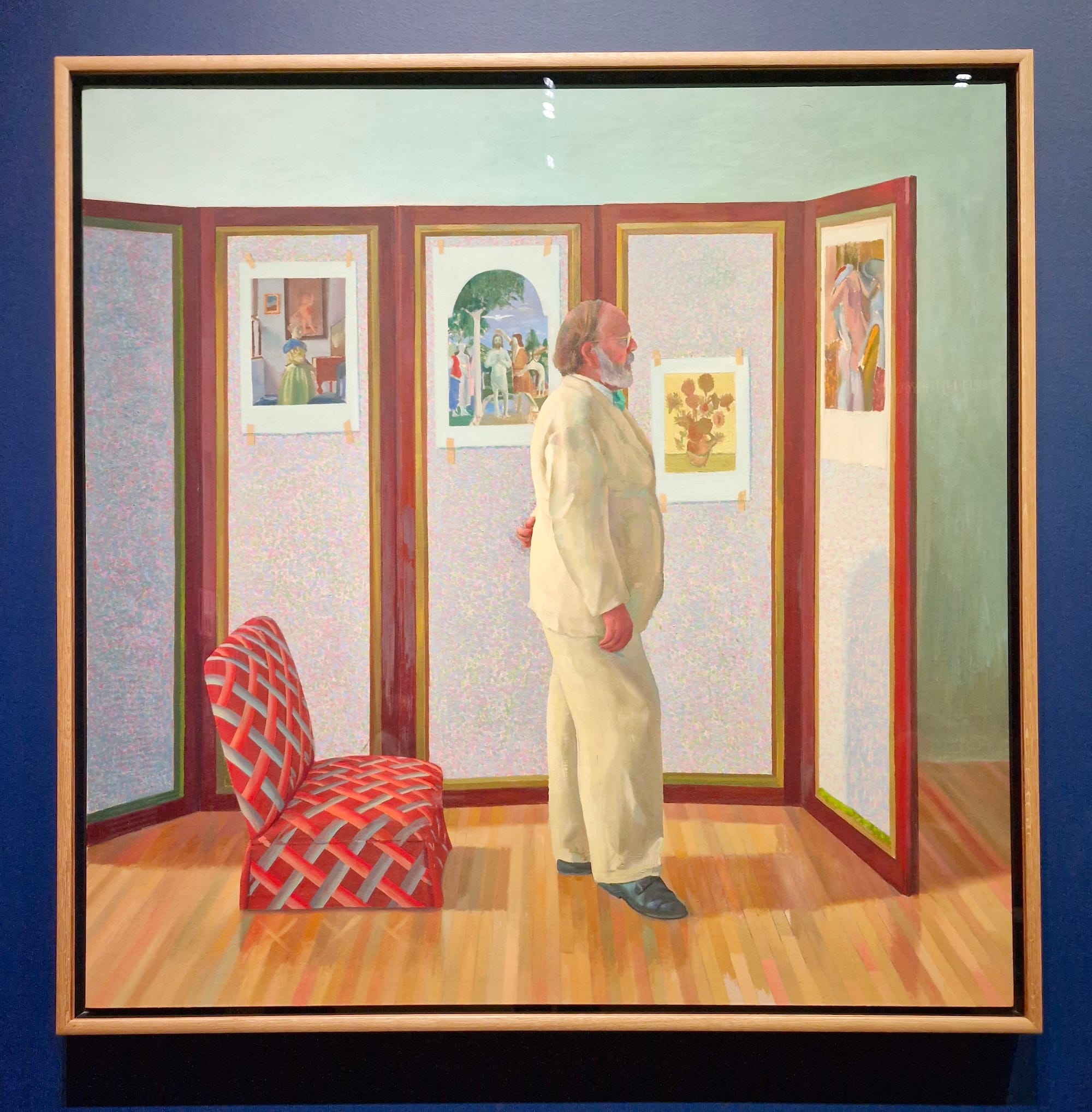 We can thank Hockney for choosing Piero, whose early Renaissance religious works dabbling in the innovation of single-point perspective arguably have had less impact on the collective imagination than big-hitting names like Raphael and Leonardo (both active when perspective had reached relative maturity). Yet the artistic inspiration conveyed by this juxtaposition is convincing and compelling, and shows that art history is a continuum of development and influence. Not only does Hockney directly cite Piero’s “Baptism” in both works, incorporating it as a reproduction pasted onto the walls in the scenes, but he highlights the secondary importance of using postcards and photographs for study (reinforced by a nearby copy of the Artist’s Eye exhibition catalogue, entitled Looking at Pictures in a Book, open to a passage in which Hockney expresses the joy of owning and pondering even of a cheap reproduction of Piero).