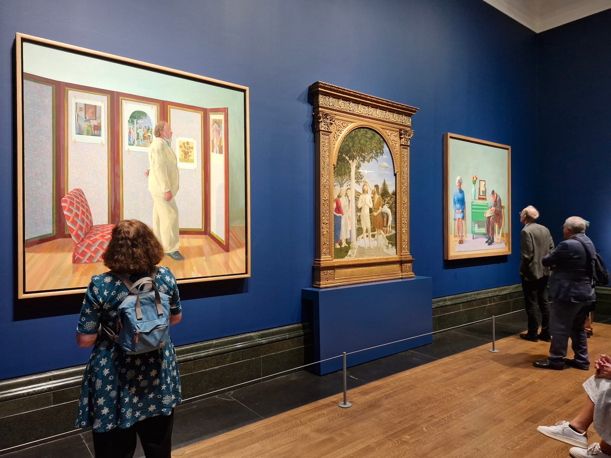 LONDON — Hockney and Piero: A Longer Look marks the National Gallery’s 200th birthday by bringing one of its oldest paintings together with works by one of Britain’s most celebrated living artists. Piero della Francesca’s “The Baptism of Christ” (c. 1437–45) is flanked, triptych-style, by David Hockney’s 1977 paintings "My Parents" and "Looking At Pictures On A Screen." The artists’ pairing points to the museum’s historic and continuing relevance in bringing art to British and international audiences — and as a resource for working artists, asserting its key role in the most current contemporary art. In the catalog's forward, Director Gabriele Finaldi cites Hockney’s longtime love and use of the collection as inspiration behind the show: It is a “birthday message,” where people can return again and again to take “a longer look.”