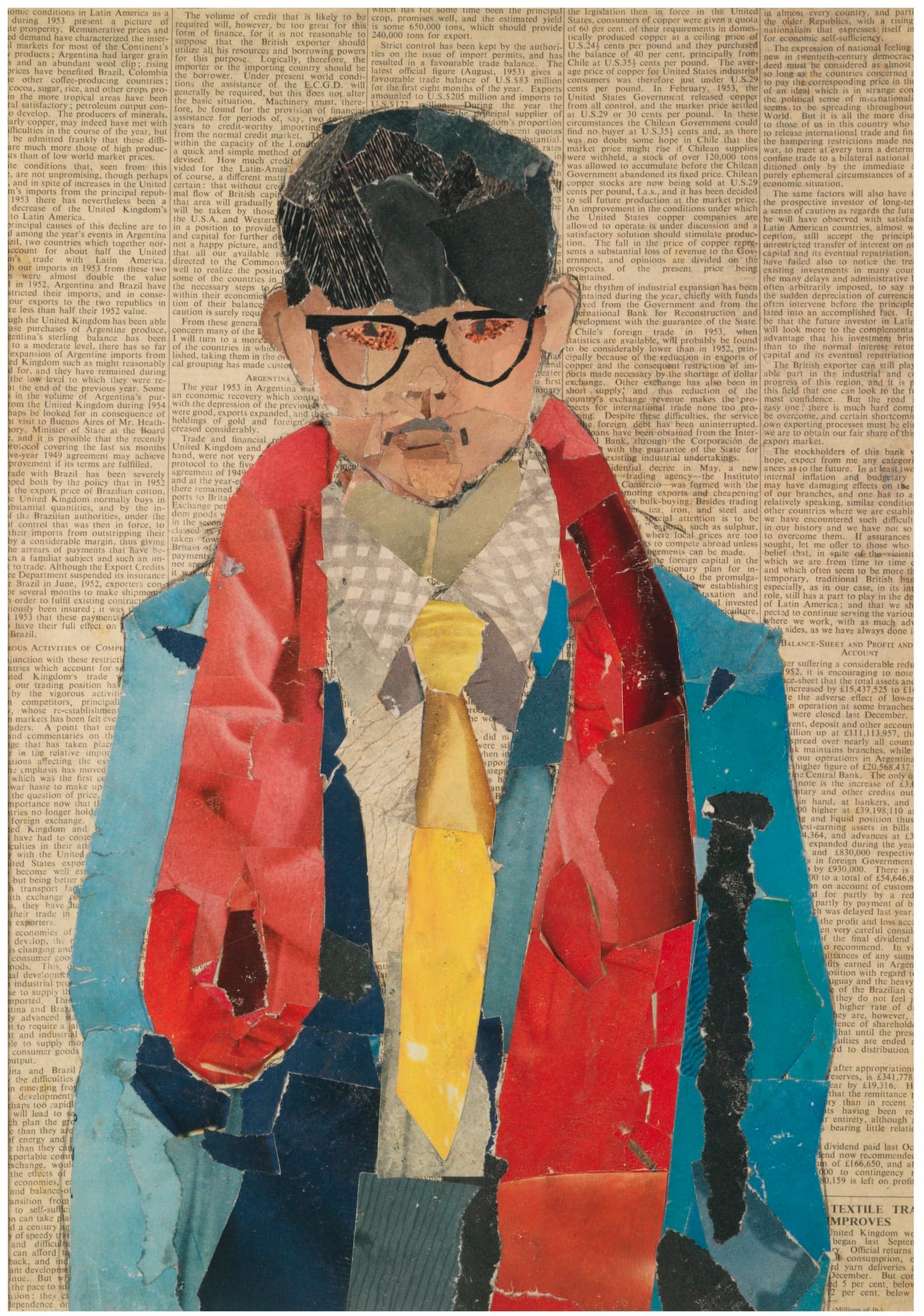 Hockney begins by staring at himself, a very serious, owl-eyed, teenage boy in spectacles. In 1954 he makes a collage of himself on newsprint. He’s definitely not blonde. Not yet. He’s sober and intent. In another, he tweaks at his tie. An uncentered tie smacks of unruliness. He scrutinizes himself with such ferocity, such sober purpose. What is this image he is trying to bring to ground? Who exactly is this boy/man in the fabrication? Although the collage of 1954 feels a bit like a careful academic exercise, the colors are already promising — or threatening — to blaze out of control, to shape and define the emotional temperature of the whole.