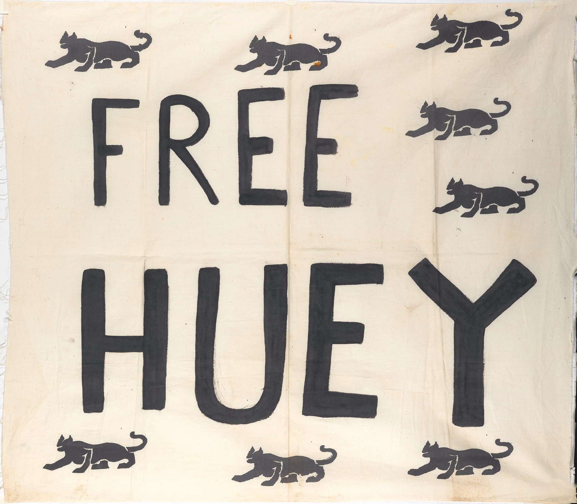 Huffman’s mother, Dolores Davis, an activist and artist, was involved with the Black Panther Party. A replica of her design of the Free Huey flag (for Huey Newton, who co-founded the party with Bobby Seale) hangs on a wall of the show, and a photo shows Huffman and his brothers as little boys with Seale.