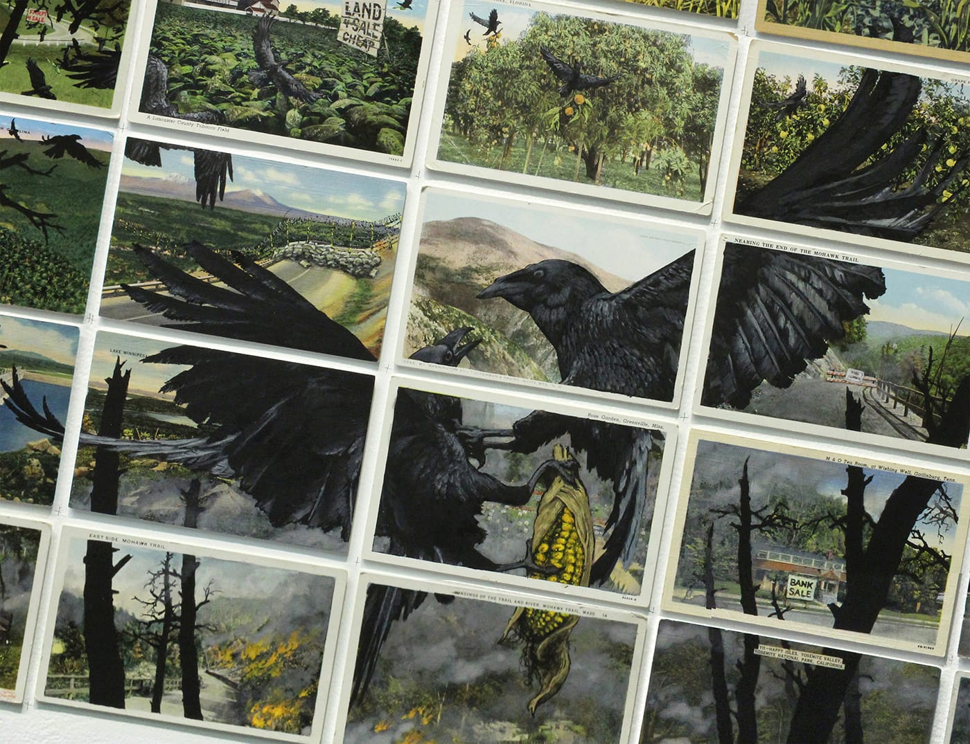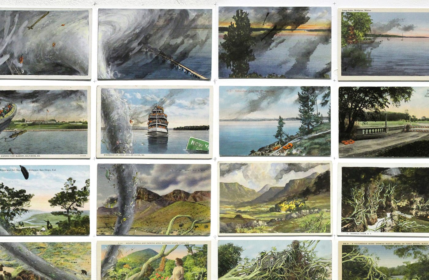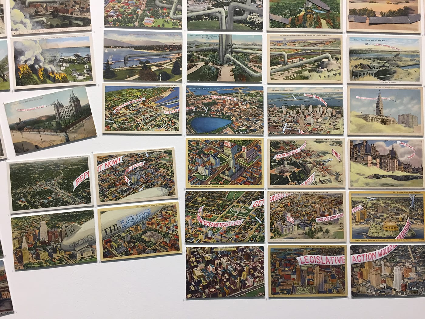 Paved With Good Intentions is a wall-sized installation that made its debut last month at University of Michigan Institute for the Humanities Gallery, and it, too, reconfigures the landscape of nostalgic America, with the most prominent piece, “This Land,” assembling and deftly intervening in 528 vintage postcards of US landmarks with scene of environmental disaster, plague, and foreboding.