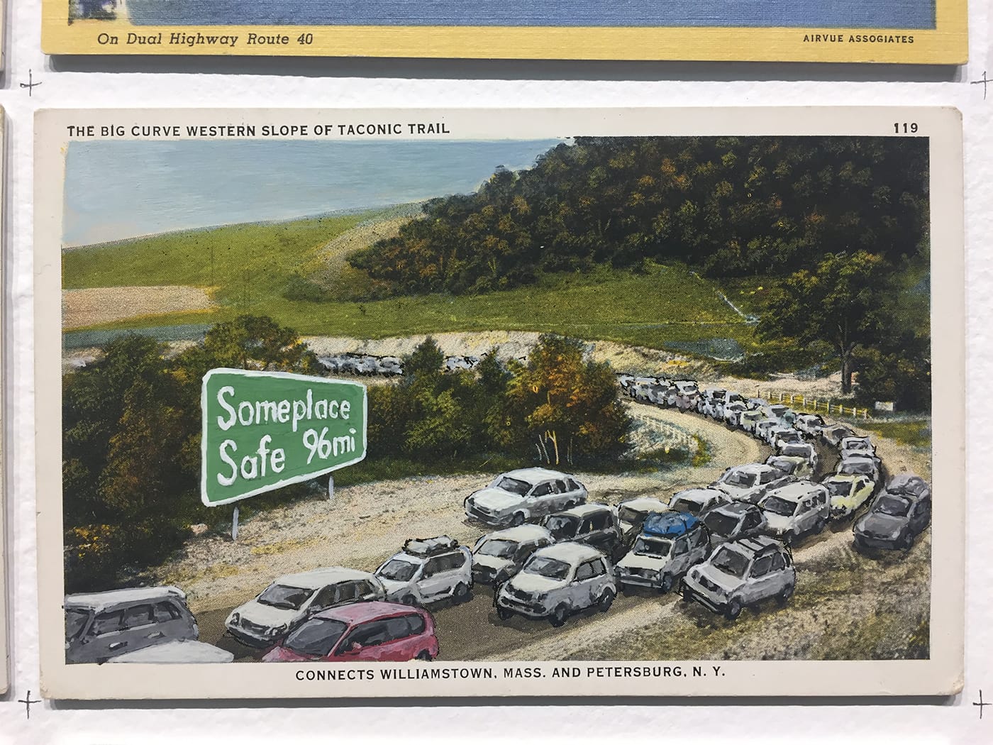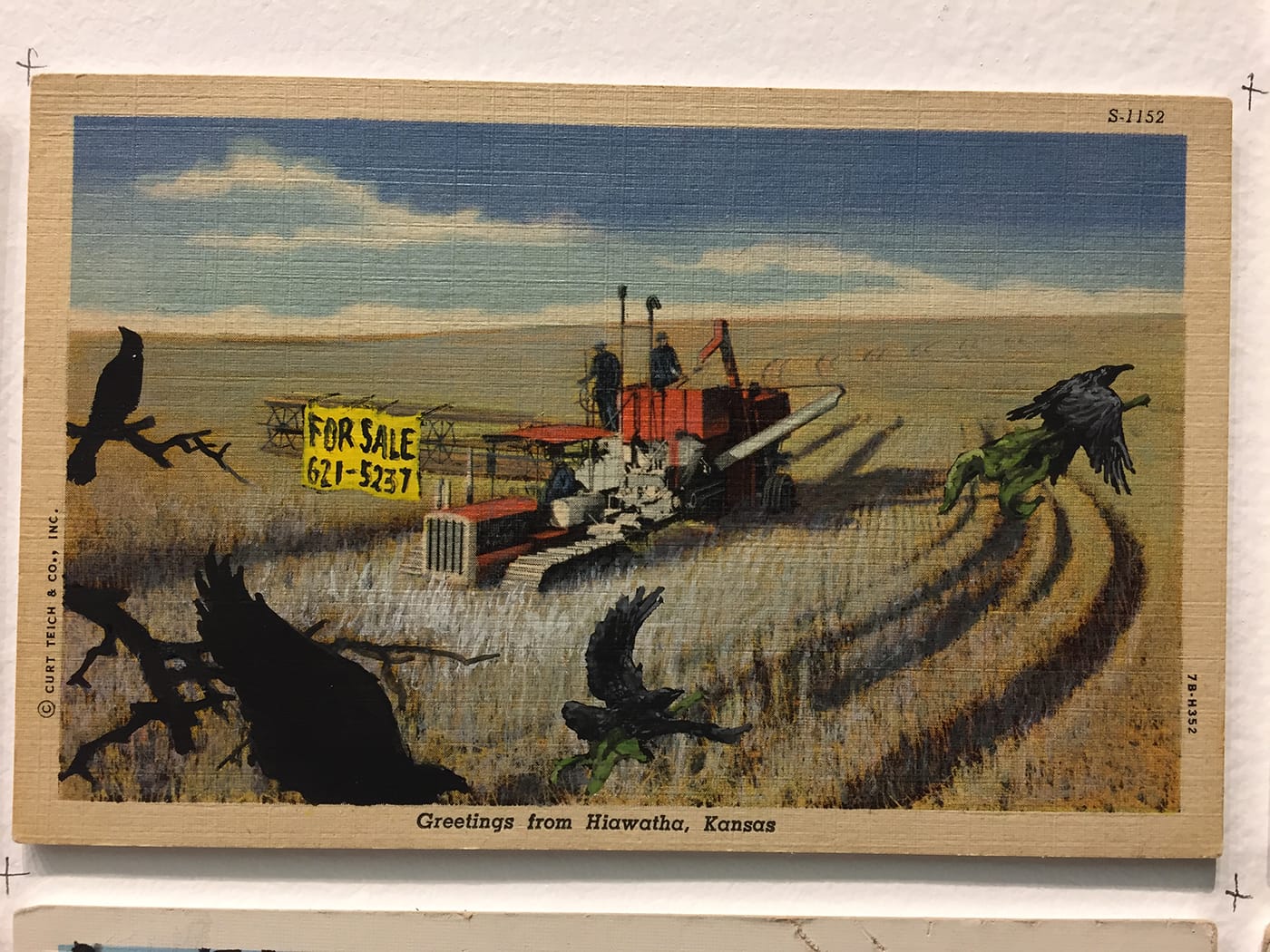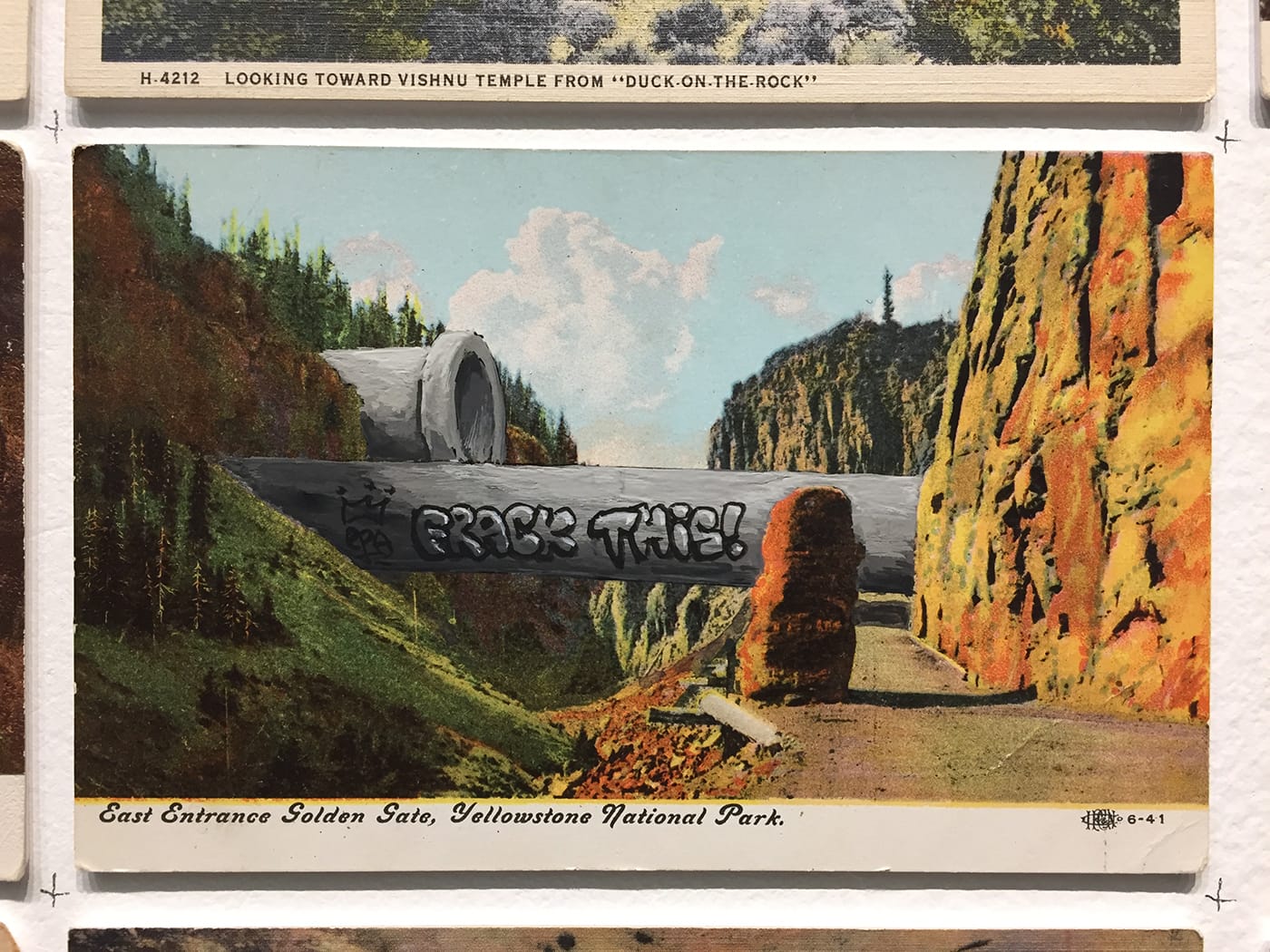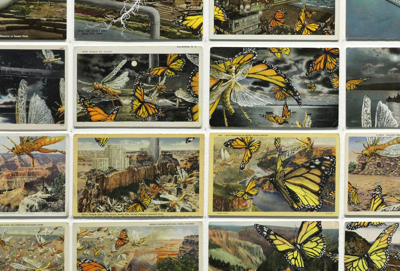 Paved With Good Intentions is a wall-sized installation that made its debut last month at University of Michigan Institute for the Humanities Gallery, and it, too, reconfigures the landscape of nostalgic America, with the most prominent piece, “This Land,” assembling and deftly intervening in 528 vintage postcards of US landmarks with scene of environmental disaster, plague, and foreboding.