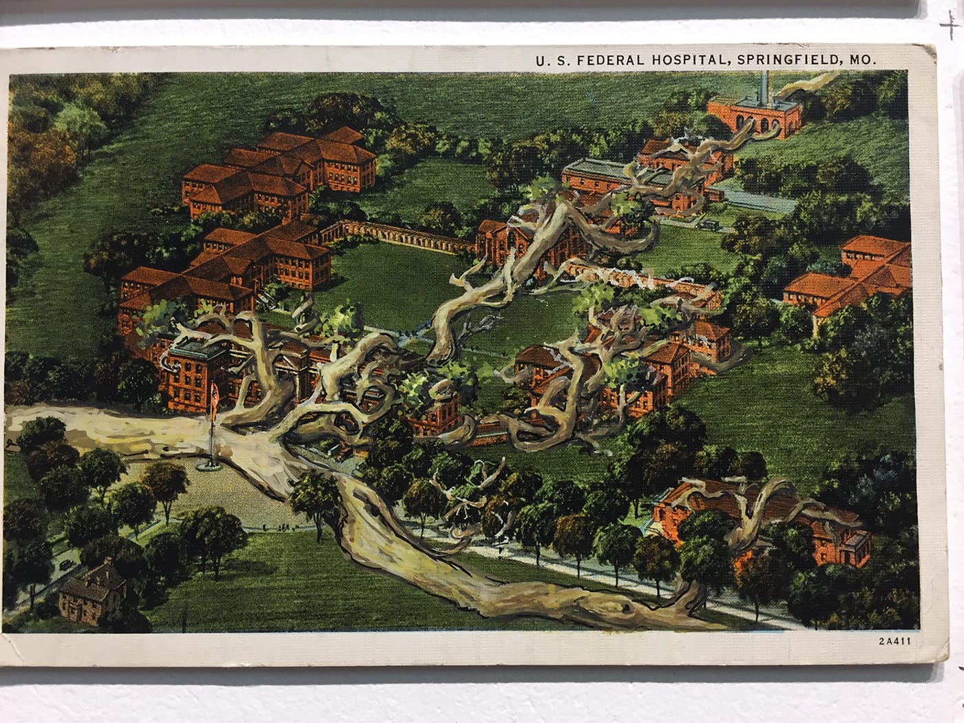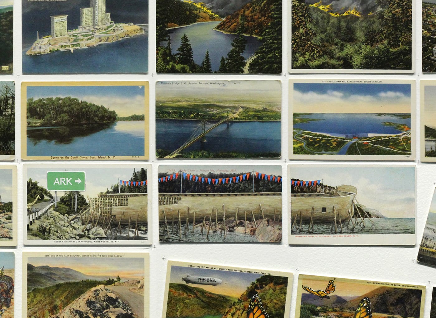 Not only does this arrangement communicate a strong sense of panic and dissolution in direct visual terms, the resulting shape intuitively mimics a rough map of the US (though the locations depicted in the postcards do not reflect their placement relative to an imagined map of the country).
