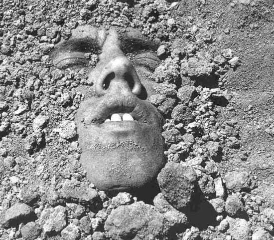 They’ve buried me in the course brown dirt, all the way up to my teeth; somehow the mouth must be opened wide so that the fillings of dirt within the jaw, over the porcelain white teeth, leaving one tooth exposed to the gum.