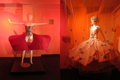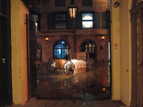 Artist Dawn DeDeaux‘s Prospect 2 installation in the historic Brulatour Courtyard in New Orleans’ French Quarter turns Toole’s tragicomedy into a frenzied fever dream filled with objects from and allusions to the novel. Centered around an unmade bed on a wheeled cart constructed around the courtyard’s fountain, DeDeaux’s “Goddess Fortuna and Her Dunces In An Effort To Make Sense Of It All” (2011) is dominated by of dozens of dunce-capped mannequins who look down upon the comically suggestive gush of water spurting from the center of tangled sheets with equal parts detachment and menace.