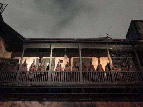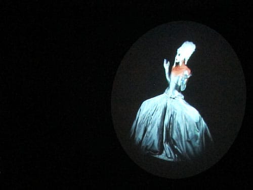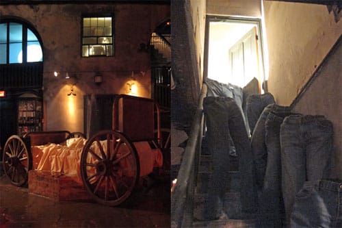 In yet another corner of the courtyard, a procession of head- and torsoless legs descend a staircase to follow another mysterious figure through an open door. More video projections of pulsing, fiery portals can be glimpsed in rooms in the upper stories of the courtyard. Another room contains articles of clothing and artwork referencing the novel’s themes of race relations in the South and the Civil Rights movement. And the whole is blanketed by a lugubrious soundtrack of a spoken Latin text (Boethius’ “Consolation of Philosophy”, if you’re still paying attention) overlaid and interspersed with 1950s lounge standards, traditional spirituals, and snippets of New Orleans bounce music.