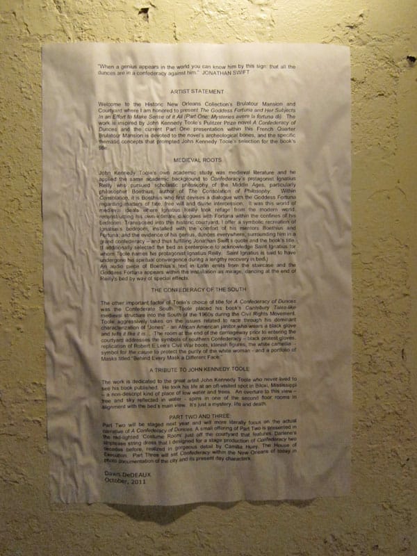 One room off the courtyard features a looping video of New Orleans bounce queens Big Freedia and Katey Red (almost unrecognizable in masks and elaborate carnival-like dress) as DeDeaux’s conception of the goddess Fortuna, who plays a central role in Ignatius’ musings in the novel; the video is reflected through windows back into the courtyard, where the dual Fortunas appear to be dancing at the foot of Ignatius’ bed.