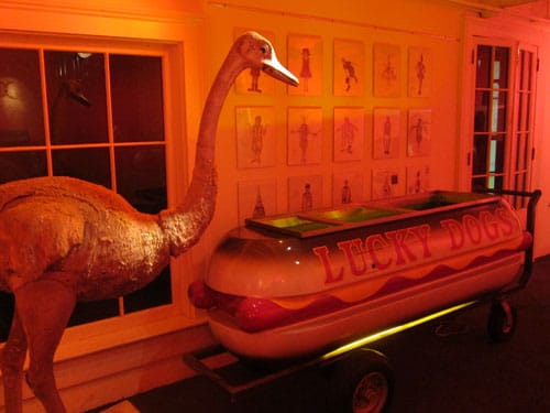 Another room contains DeDeaux’s sketches for the costumes and set designs for a 1991 stage production of “Dunces,” along with three costumed mannequins arranged among a vintage jukebox, a giant stuffed bird and a Lucky Dog cart with a plaid-shirted decomposing corpse tucked inside.