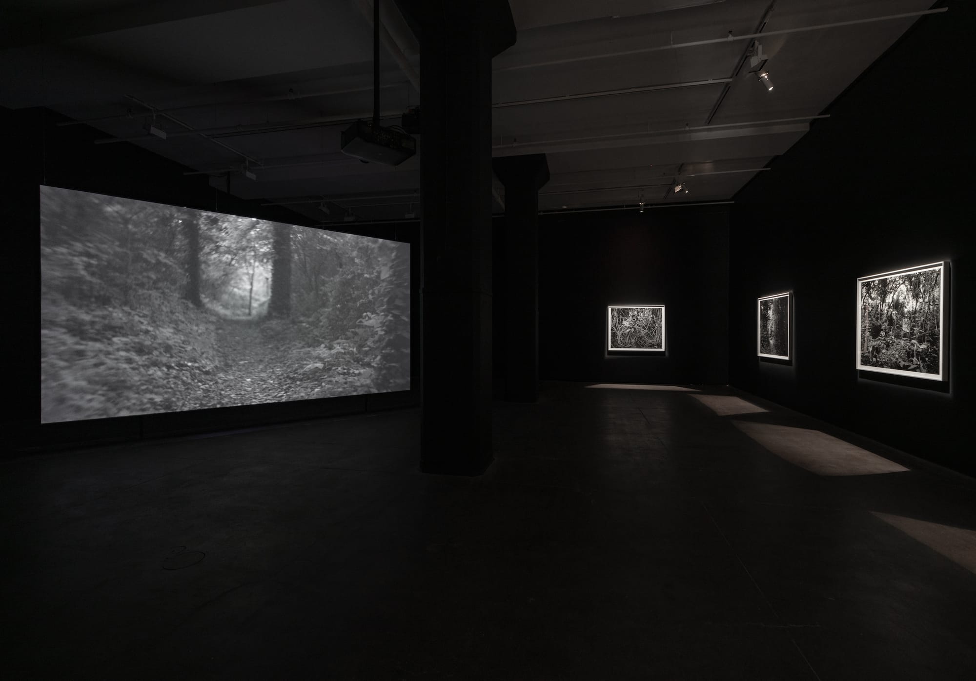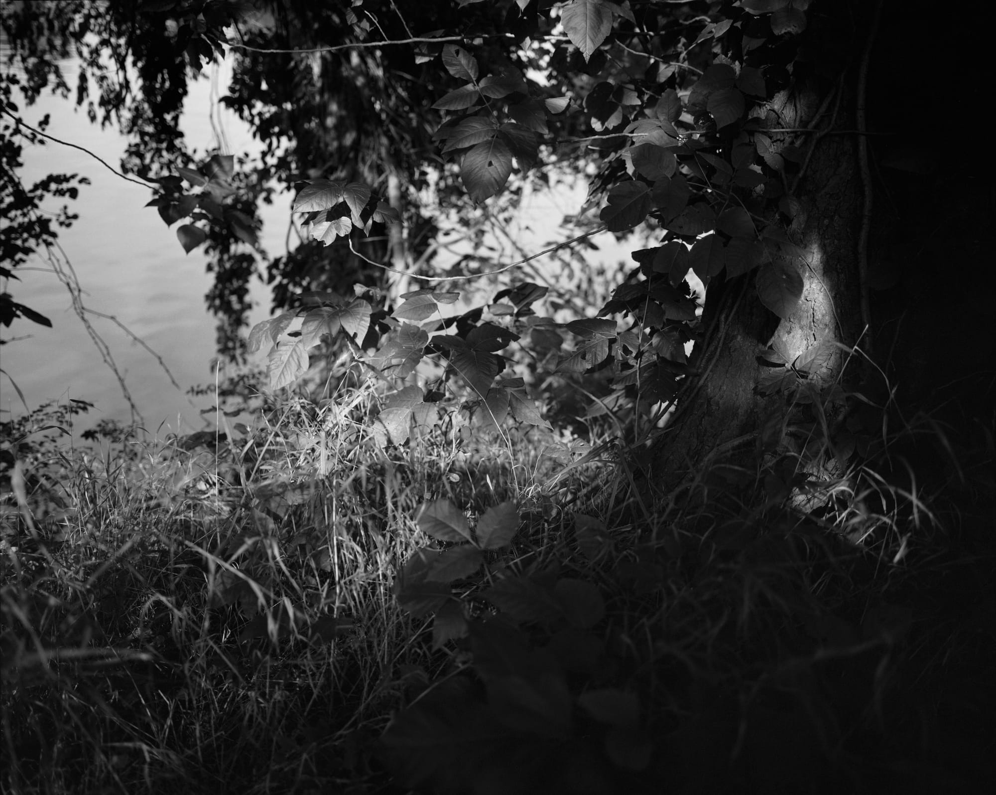If you were to peer at the reclusively lit gelatin silver photographs mounted on Dibond, as I did, you would encounter forest scenes in which dappled sunlight pierces through a leaf canopy; the undulant surfaces of tranquil bodies of water reflect the sun and the nearby trees; earthen paths gouged out by humans curve and meander through verdant, natural growth; and tree limbs intervene on these paths at odd angles, arced and bent like gnarled scaffolding. One word that aptly describes these scenes is “beautiful.”