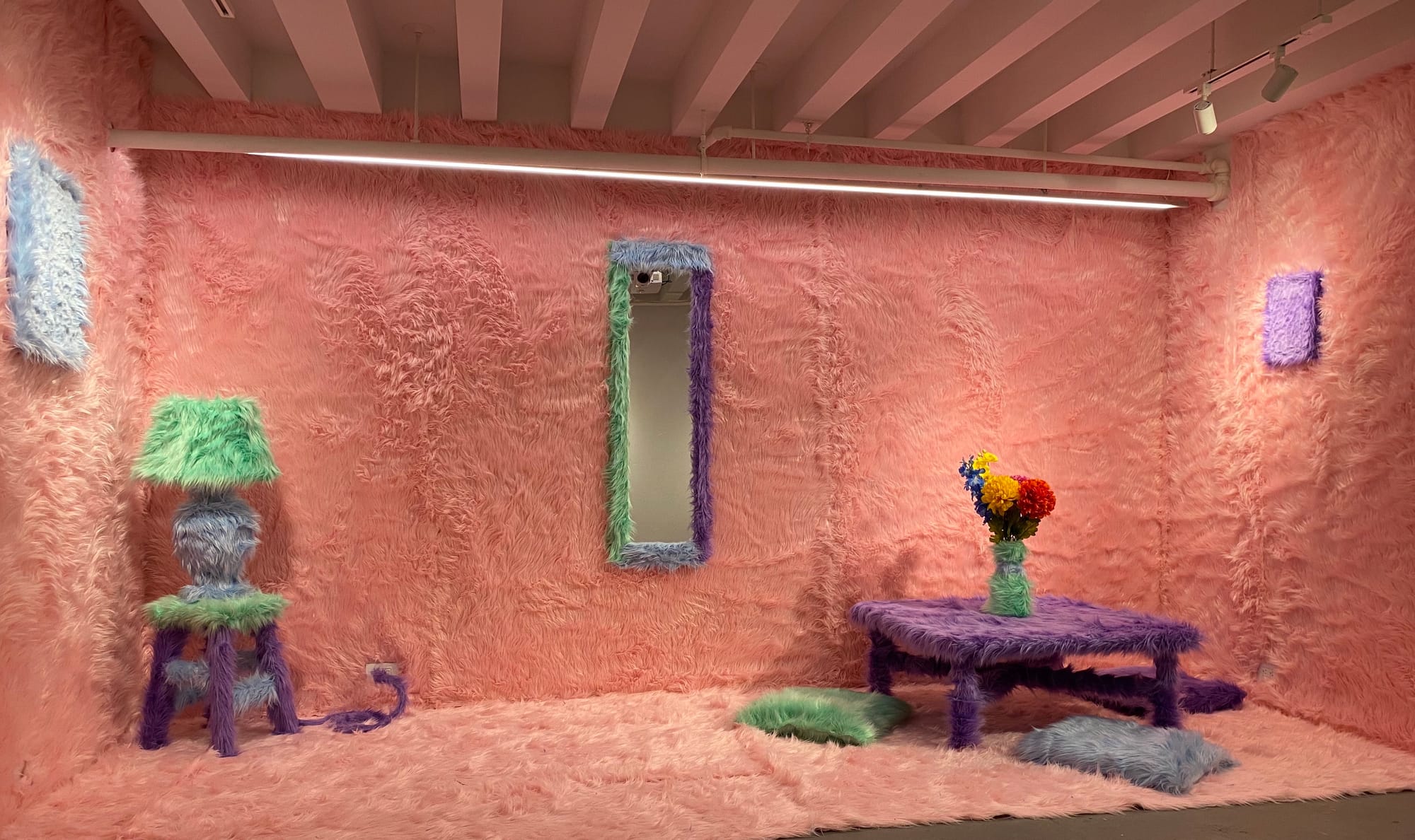 De Lo Mío concludes abruptly with Cepeda’s haunting installation, “el pasado me trajo aqui” (2021), entombed in the back of the crowded downstairs gallery. A windowed corridor confines a hushed landscape, carpeted with the artist’s velvety textiles. My gaze meets a spotlight at the center that warms an assortment of small, found objects: a shell, placed near a devotional candle and a faceless terracotta figurine, standing stiffly, as if ready to be purchased, carried overseas, and housed on a shelf for eternity. The work elicits subjects that abound in De Lo Mío — tourism, migration, and national identity — informing the exhibition’s formidable and at times, paradoxical journey to record collective memory.