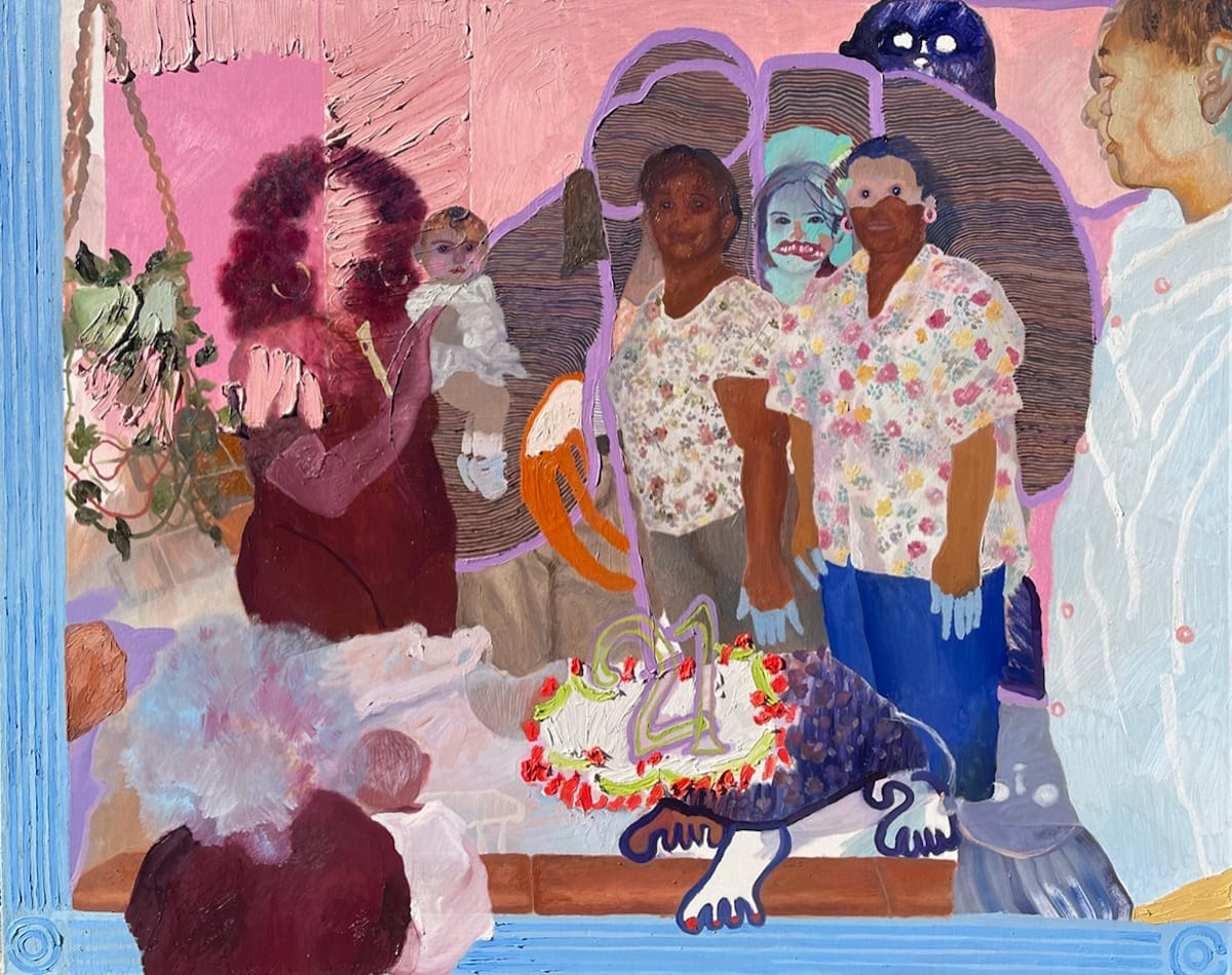 As if piecing together a fleeting dream, Fernandez layers a cacophony of hues and textures to create compositions that resemble images in a family photo album. In “Between This and Myself (You Never See Me)” (2021), figures — some fully rendered and others barely discernible — crowd around the number 21, embellished with the sort of garish calligraphy reserved for birthday cake. The work is installed across from Hernandez’s enigmatic portrait, “Clipped” (2021), in which a nude woman with a steady gaze nuzzles a dish that holds a bleeding chicken foot. Ripe swatches of coral, supple browns, and notes of green and cerulean are infused in these works and those surrounding, ushering viewers into a steamy, and ultimately unforgiving climate.