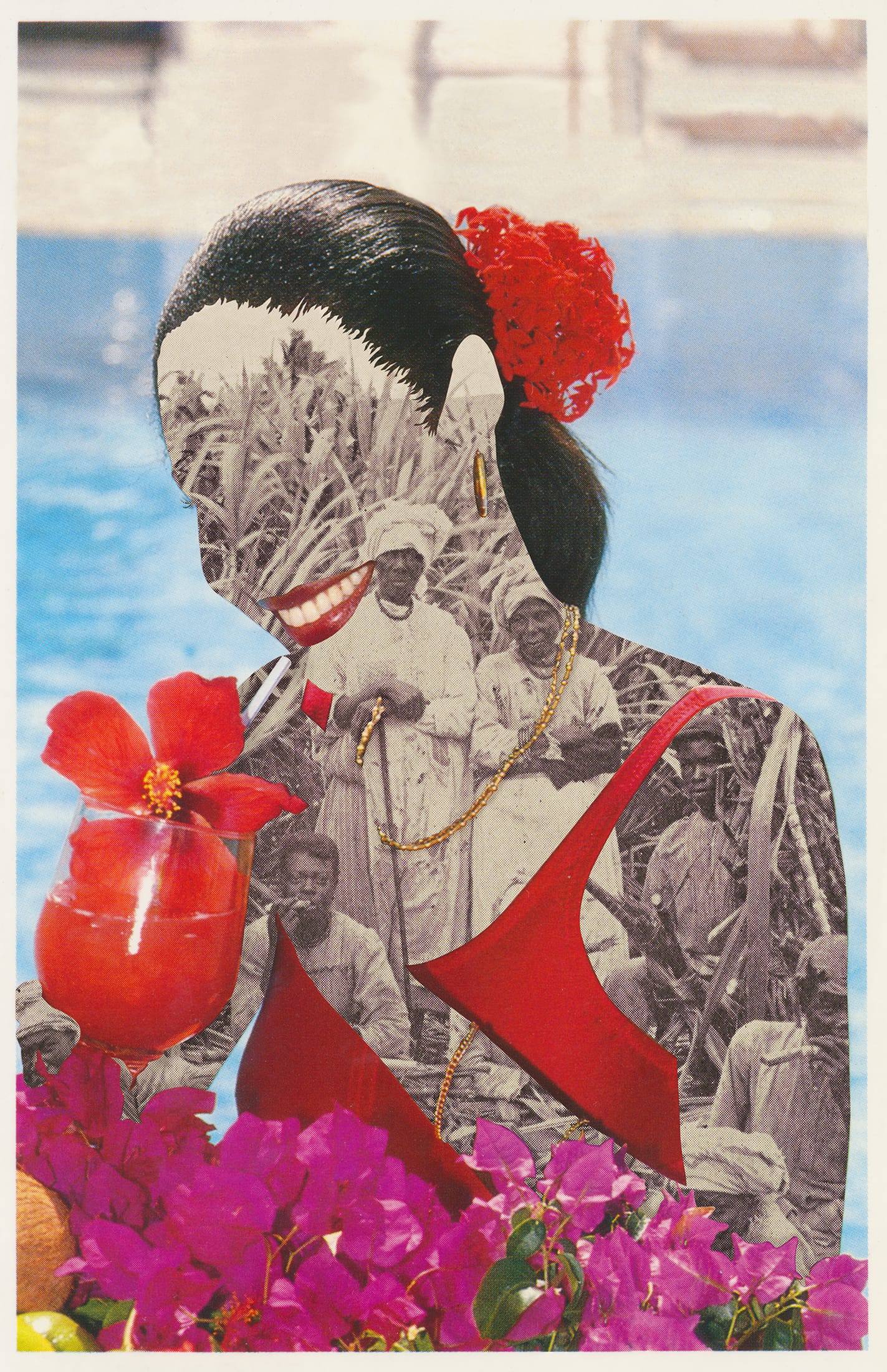 As this vibrant palette sweeps across De Lo Mío, it deepens, and darkens, evolving into a loaded signifier that surfaces deep-seated histories of coloniality in the Dominican Republic. In Minaya’s archival pigment print “Continuum II” (2021), flashes of hypnotic blue and hints of peppery red harbor sinister legacies. Here, the multidisciplinary artist juxtaposes a contemporary photograph of a Black woman (presumably a tourism worker) with a portrait of a Black woman performing comparable labor centuries ago. The contemporary worker smiles as she carries a silver tray with pineapple cocktails while the woman superimposed on her left mirrors her, clutching a silver platter topped with richly saturated fruit. These blazing hues sour with the fruit, becoming one among many visual threads that link the colonial past to the neocolonial present.