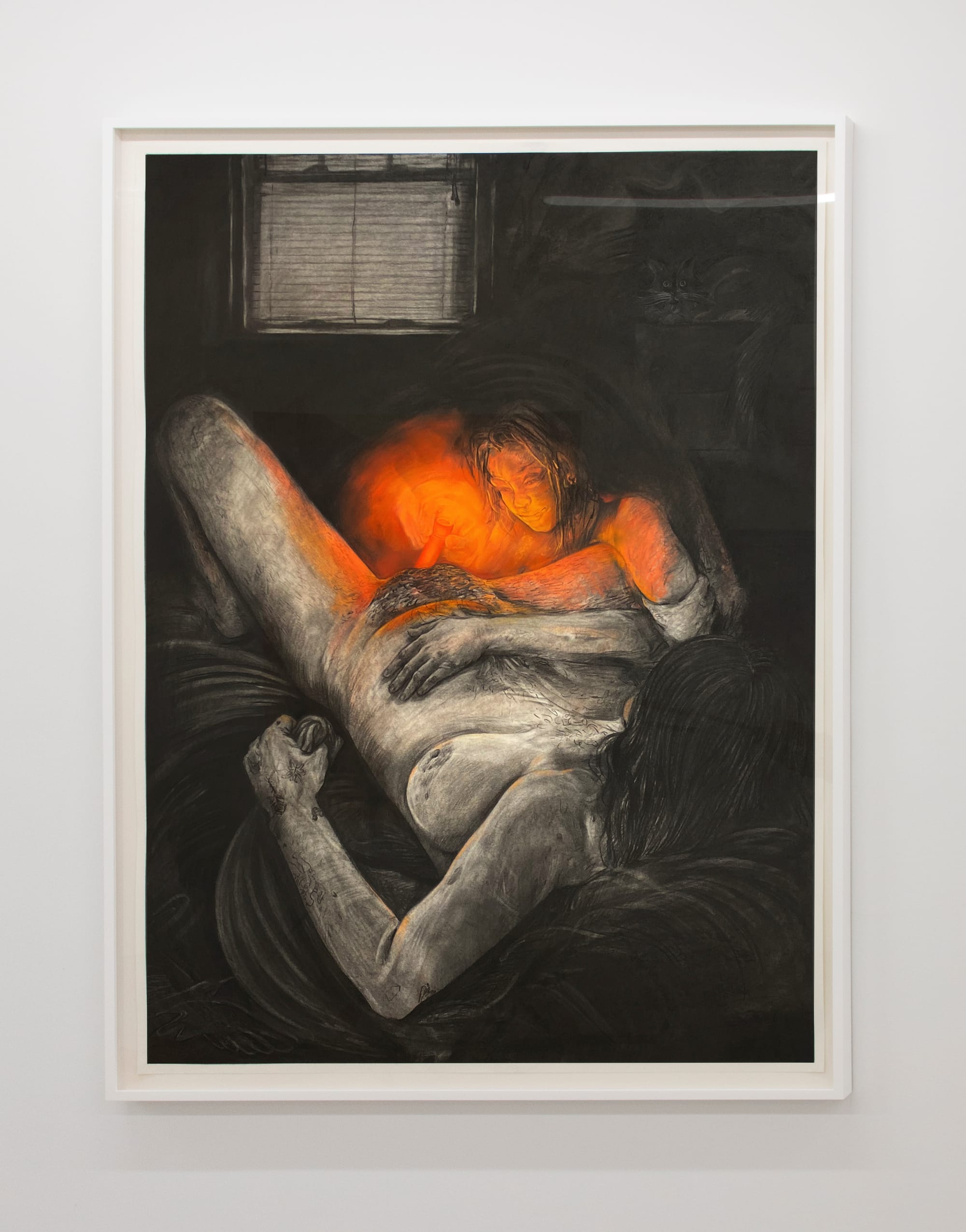 Gender and sexuality are likewise fluid in form and character for the show’s 13 artists. Cutouts of half-nude models and Mayan figurines merge in Felipe Baeza’s photo-collages. Muscle definition shifts seamlessly into molded clay, revealing ageless beauty. Alina Perez’s “Dreamsicle” (2020) occupies the opposite wall, flanked by windows looking out across Lower Manhattan. Two lovers embrace in a dark bedroom. One holds a glowing orange vibrator against the other, who clenches sheets in one hand, evoking orgasm and anguish.