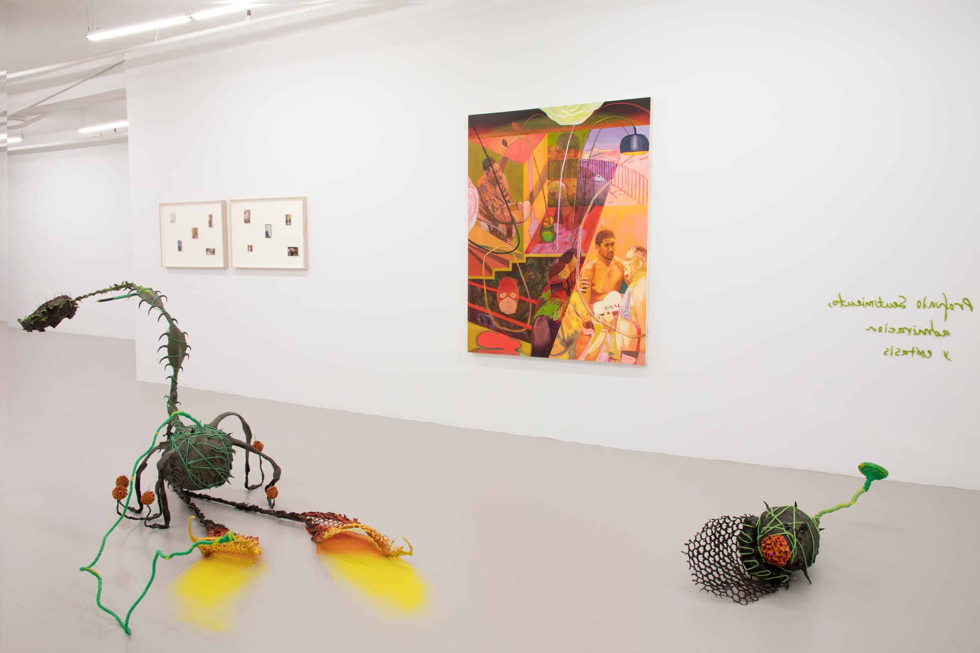 In the center of the gallery, two bulky pieces of Diana Lozano’s sculpture, “Palingenesis” (2020), trail neon paint onto the floor like snails in motion. One of their tendrils holds a mirror to clay text adhered backwards on the wall: “profundo sentimiento, admiracion y extasis” (deep feeling, admiration and ecstasy), from a book on orchids written by the artist’s father. In this phase between outbreak and inoculation, it’s easy to feel trapped by imminent mortality and frustrated passion. Castaneda invites us to exist in the intermediary for a moment, and wait for this tension to release.