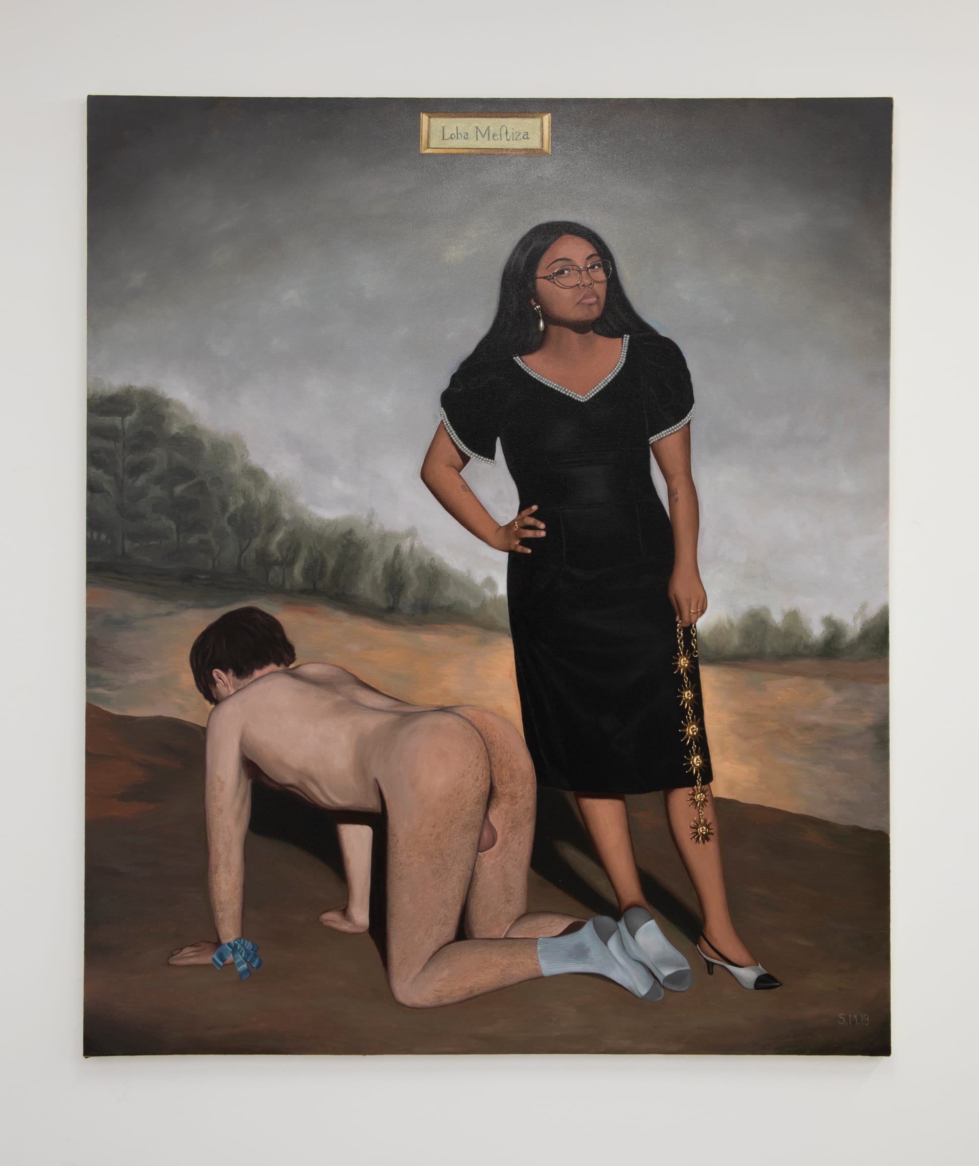 Such erotic confrontation abounds. From the hallway leading into the gallery, a young dominatrix stares down visitors from Sergio Miguel’s “Loba Mestiza” (2019), with one hand on her hip and the other wielding a gold chain. Her high-femme demeanor is accentuated by a tight black dress, gold-framed glasses, and heels. At her feet, a white man crouches on all fours wearing nothing but white socks, his scrotum hanging clumsily between his legs. The composition subverts the visual language of casta paintings — an 18th-century Spanish colonial tradition that perpetuated racist myths and classifications in Mexico — and the scene unfolds beneath a gold plaque bearing its title, which translates to “half-breed wolf.”