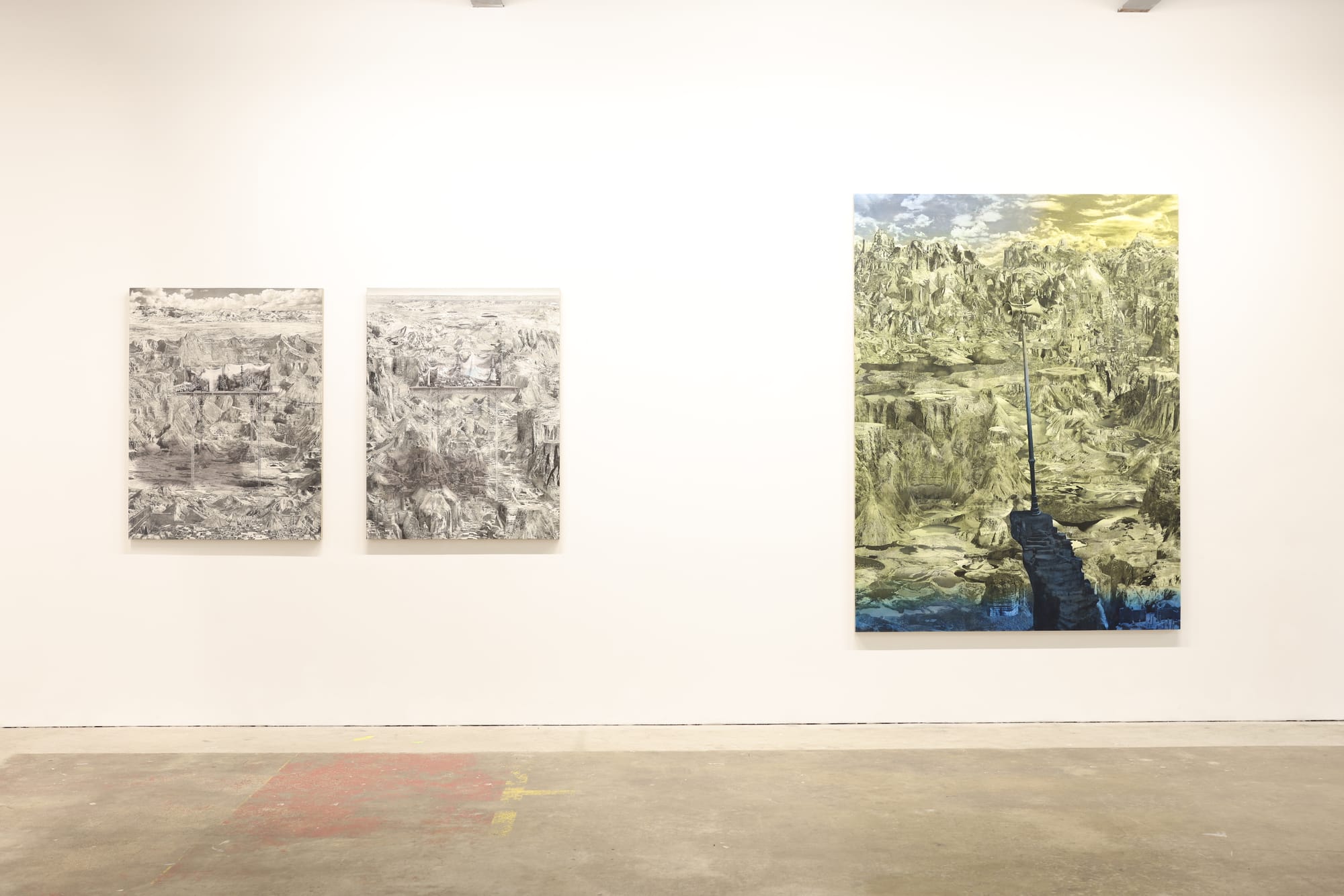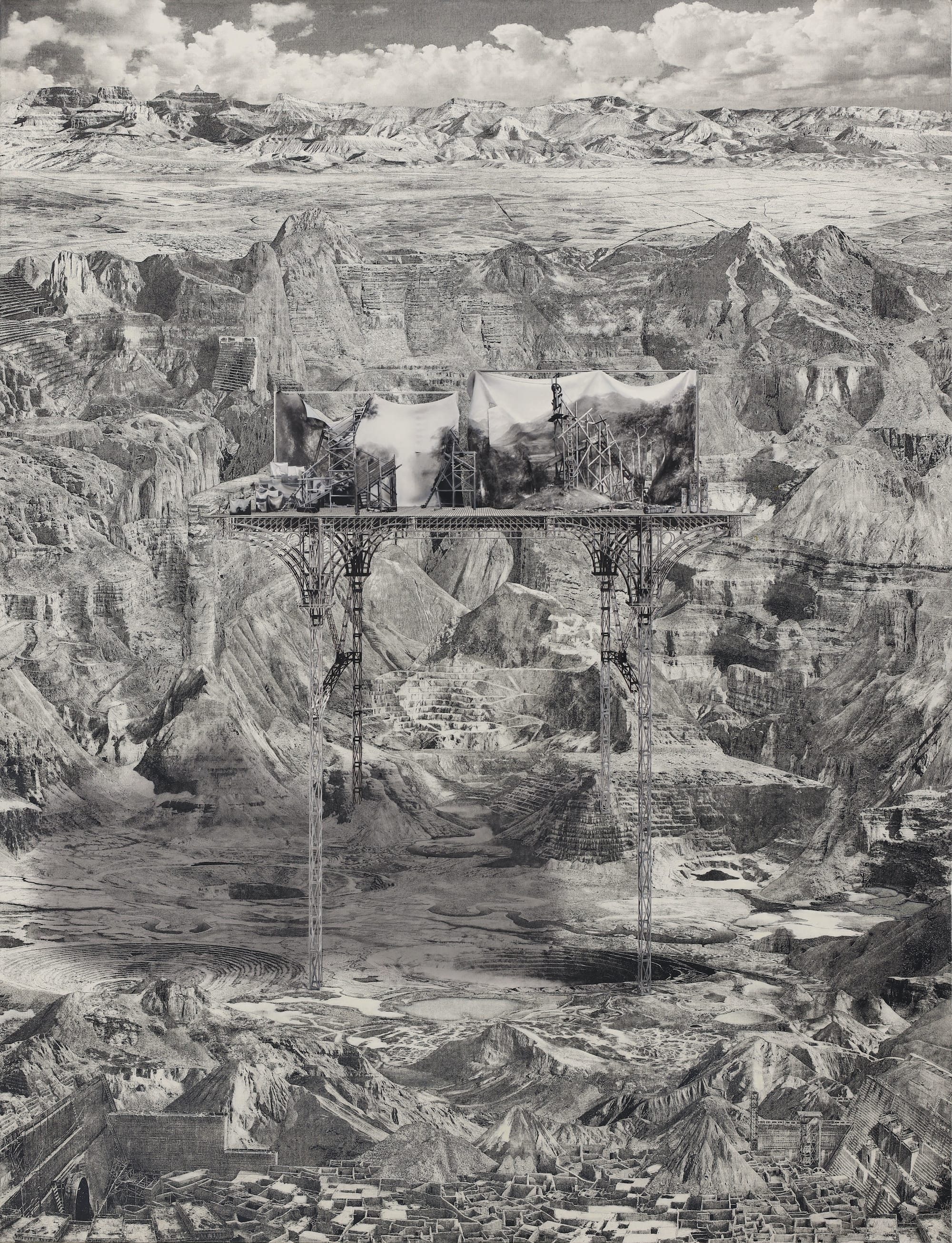 Cassandra: Truth and Madness reflects our current geological epoch: a time when humankind is witnessing its handiwork, with all its beauty and horror, threaten to destroy the earth’s species and habitats. Many of the exhibition’s 12 densely configured paintings were inspired by photographs of the two largest manmade mines in the world: the Bingham Canyon Mine in Utah and the Grasberg Mine in Indonesia, both visible from outer space. In Colossus 1 – 4 (2022), Byington drapes a Frederic Church pastoral scene from a frame atop a raised platform in the center of these leviathan sites. The Colossus series of images, with their historical and sociopolitical themes, set the tone for the show. Church’s idealized landscapes embodied concepts of Manifest Destiny as a way of obscuring the ugly truth of American expansionism. In Byington’s hands, the contrast of layering one manmade construct atop another — Church’s sublime horizons arrayed like a tiny curtain over the giant open pit of the mine — accentuates the devastation that political narratives seek to veil.
