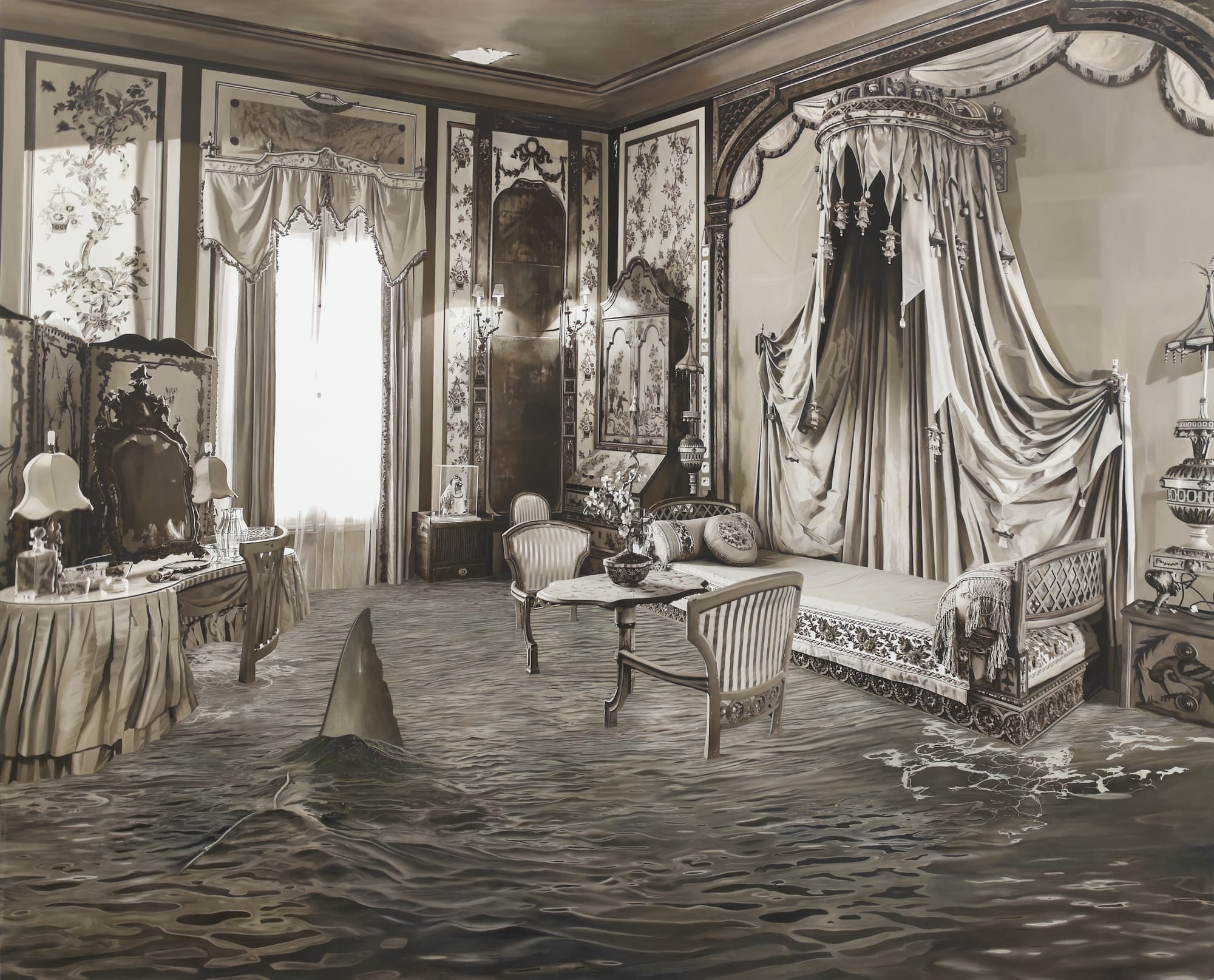 By the time viewers reach “Oceans,” that crisis is no longer a prophesy. It is an invasion — a rising tide that submerges the glamorous boudoir furniture. A shark glides across a swamped floor, and a stark-white light that brings to mind the flash from a nuclear blast illuminates the room.