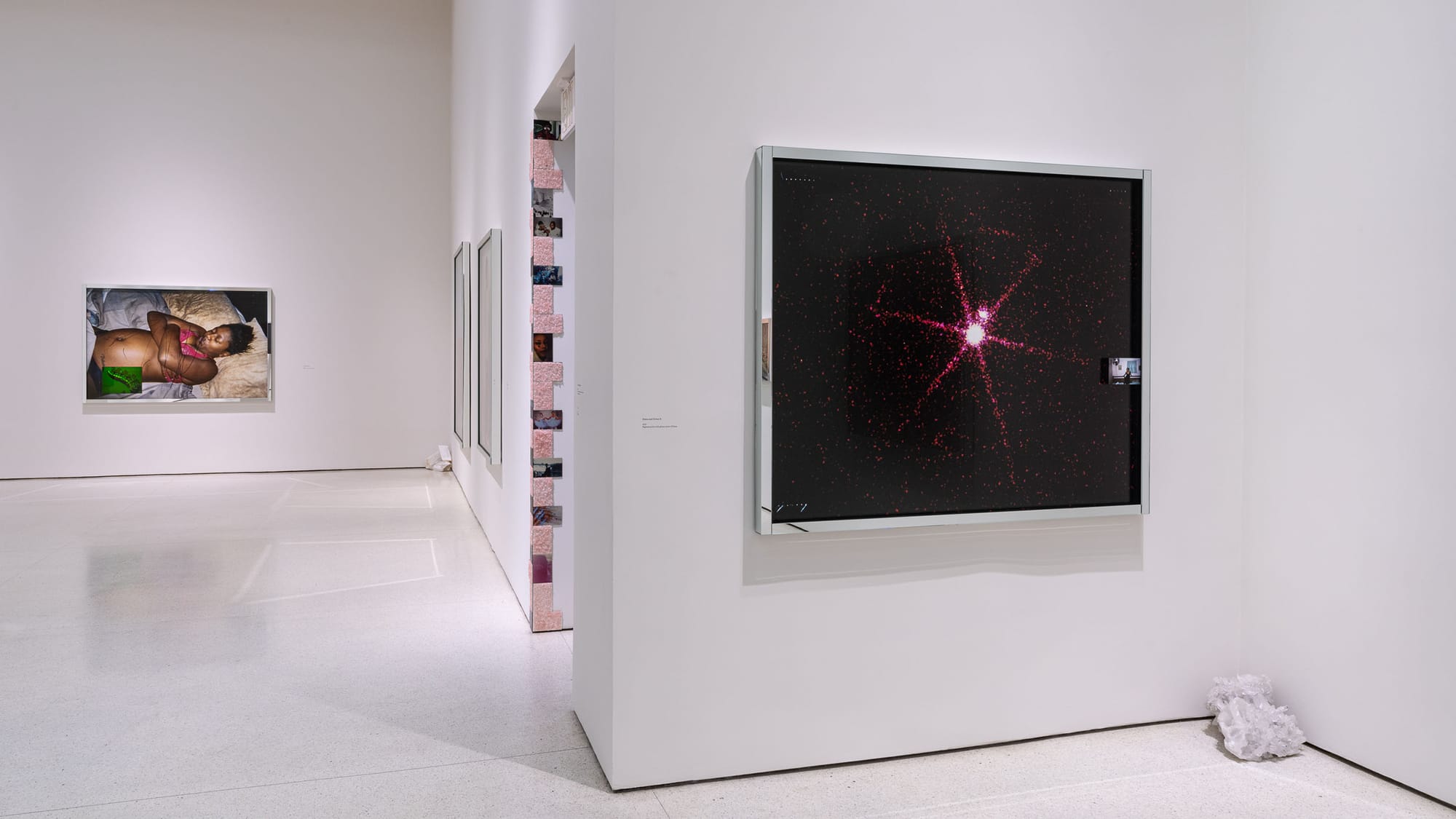 To usher us into the mythic realm, Lawson’s work manipulates the spacious gallery itself. Halos of light, bouncing off of mirrored frames, aggrandize the subjects of each photograph. Meanwhile, brilliant crystals, which shine from each corner of the gallery, refract streams of light from these luminous frames. At the center of the gallery, the work “Torus” (2021), a hologram so subtle I missed it upon first glance, reflects an iridescent prism of light and as I peer through it, Lawson’s surrounding photographs glimmer with nostalgia, like images uncovered from a family photo album.