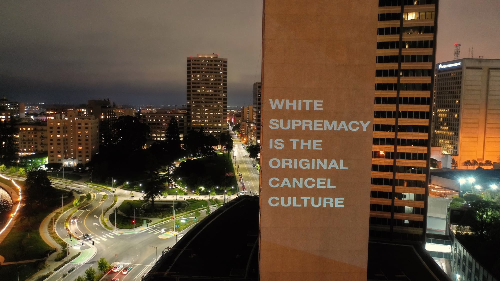 Many of the images have been thrown up on the walls without permission, including Cathy Lu’s “We Are One Family,” in Chinese, with three raised hands with long, red nails, and Chan’s “White Supremacy is the Original Cancel Culture,” in white block letters. But for the final event, on August 12, at the Montalvo Arts Center south of San Francisco, Chan worked with the leadership there to organize the event, which they see as a corrective to their history.