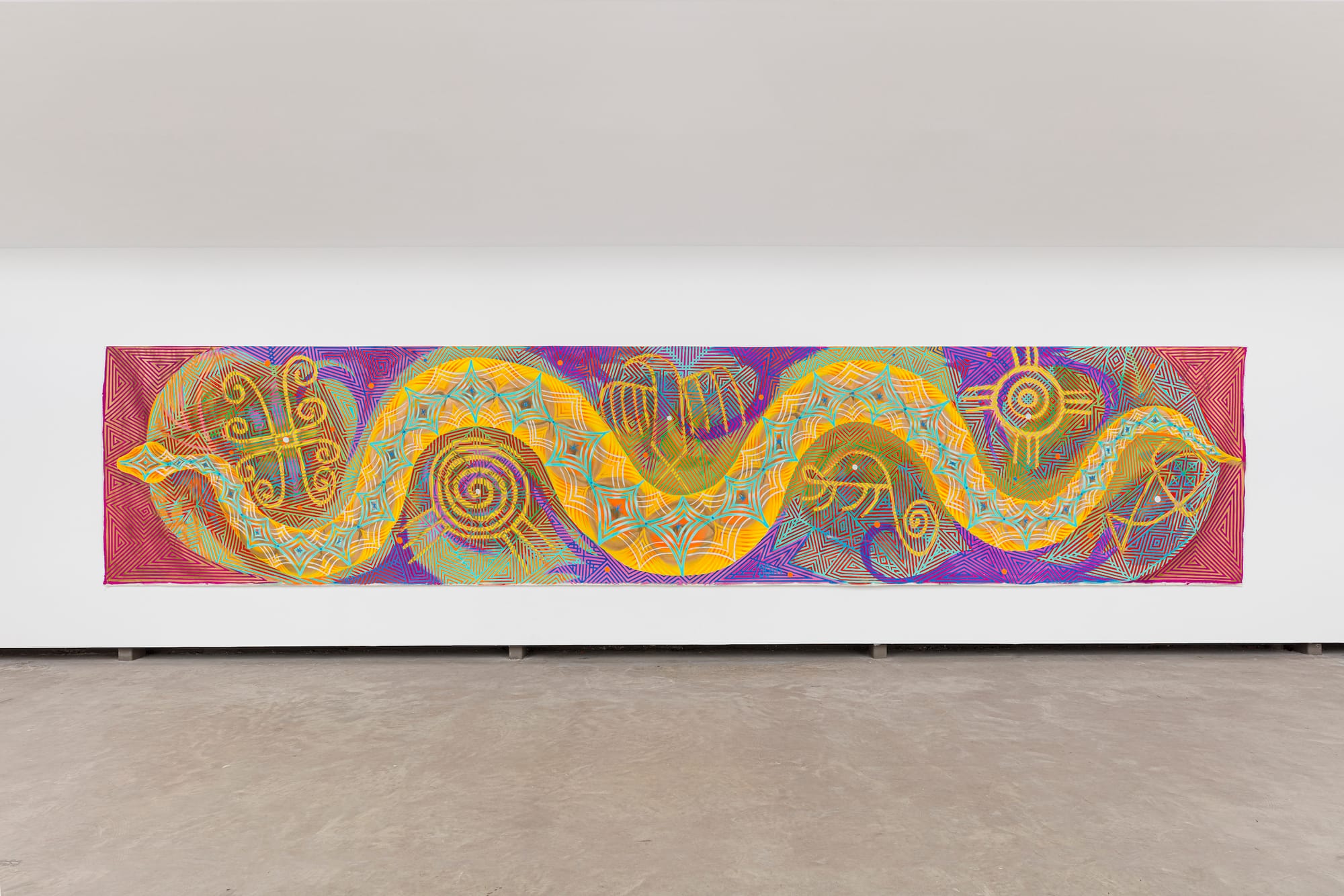 Even though the world is damaged by human actions, it still contains myriad wonderful things that deserve our attention, as well as a legion of horrors that must not go overlooked. Dear Earth effectively juxtaposes these two sides of the environmental movement. For example, in specially commissioned paintings by Daiara Tukano, of the Yepa Mahsã people, graphic patterns weave together trees, animals, and people, joyfully depicting the networked animacy of the living forest, while “Grid (Palimi-u)” (2021), a film by Richard Mosse screened nearby, documents emotional speeches by Yanomami people condemning the shocking impacts of illegal mining and deforestation.