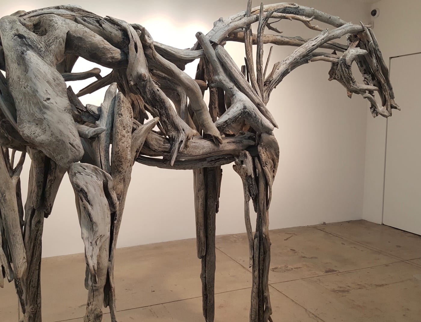 Then I read the captions and found out that all the pieces are cast in bronze and was simultaneously disappointed and enlightened. That move gives away the entire game for me, but makes the work infinitely collectible. Carol Corey, a partner of the gallery, said to me that Butterfield first worked with found objects and in the 1980s switched to bronze “to make them last.” The horses only seem fragile, barely held together, but manufactured in bronze instead of bleached driftwood, they will stand in a corporate lobby for ages, and will likely outlast us all. Butterfield will undoubtedly continue to churn these out, and Danese Corey who have been representing the artist since 2010, have found a winning formula. At its core, these sculptures are a visual metaphor for ineffable nature of a creature we consistently use and sometimes revere, but do not take into our homes. Horses have always been close to us, a crucial part of our development into modern people, our metonym for speed, yet alien, not truly domesticated because they live for themselves, not us. The fragility of that peace we have made with them could be part of that work, but then, I suppose, it wouldn’t be as salable.