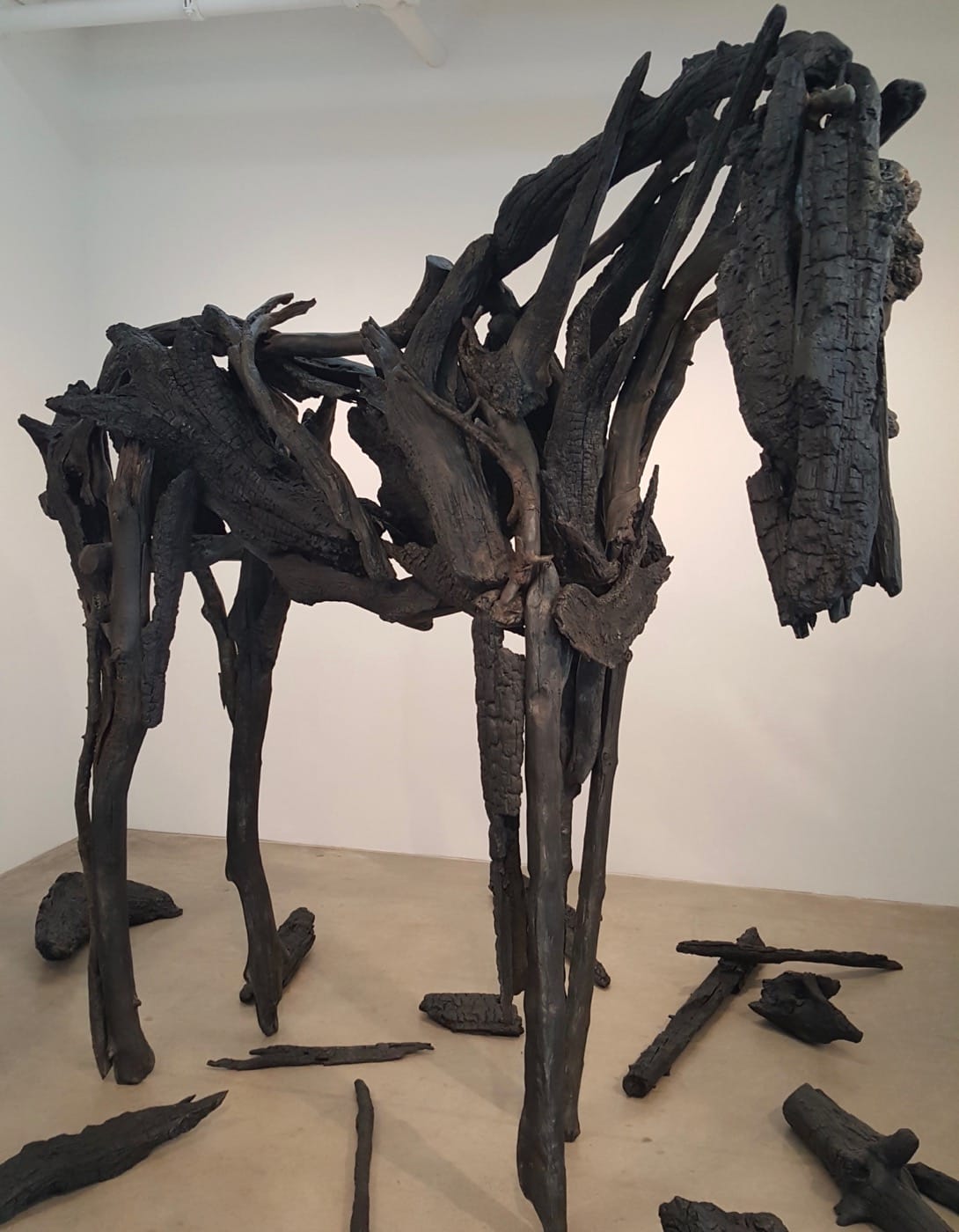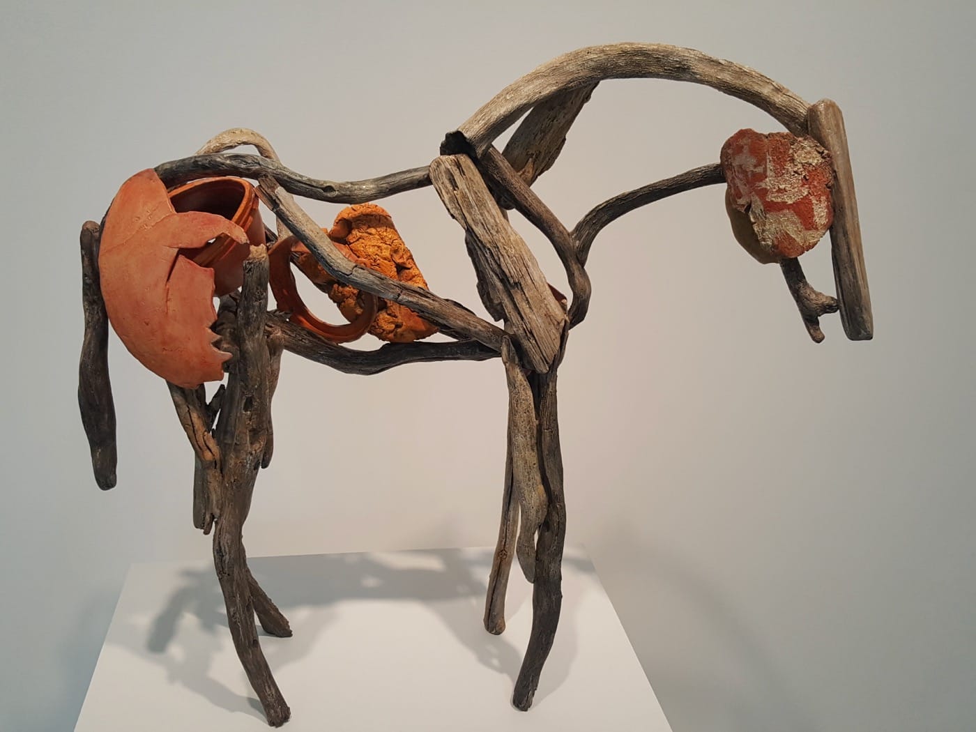 For me, there’s something post-apocalyptic about Deborah Butterfield’s horse sculptures. Certainly they have that appearance of a creature out of the imagined world of fantasy (like Game of Thrones): sparse stick figures that are blasted by fire or wind or sand, wretched, seemingly held together by necromancy and ill will. The artist has reduced the horse to its skeletal structure, with occasional bits of what looks like reclaimed colored plastic debris to substitute for musculature. The horse is one of those creatures that is easily recognizable even in outline form: just the snout, belly, legs and tail is enough. Butterfield takes advantage of that iconic physicality to make these sculptures that have manifestly wide appeal. Seeing the work at Danese Corey gallery, I feel I’ve encountered the work before. I likely have given that Butterfield’s horses, by my count of the list in her bio, has been collected by 88 museums and corporate institutions including BankAmerica Corporation, Clise Properties, Principal Financial Group, the Museum of Modern Art, the Whitney Museum, the Metropolitan Museum of Art, the Hirshhorn Museum and Sculpture Garden, and the Walker Art Center.