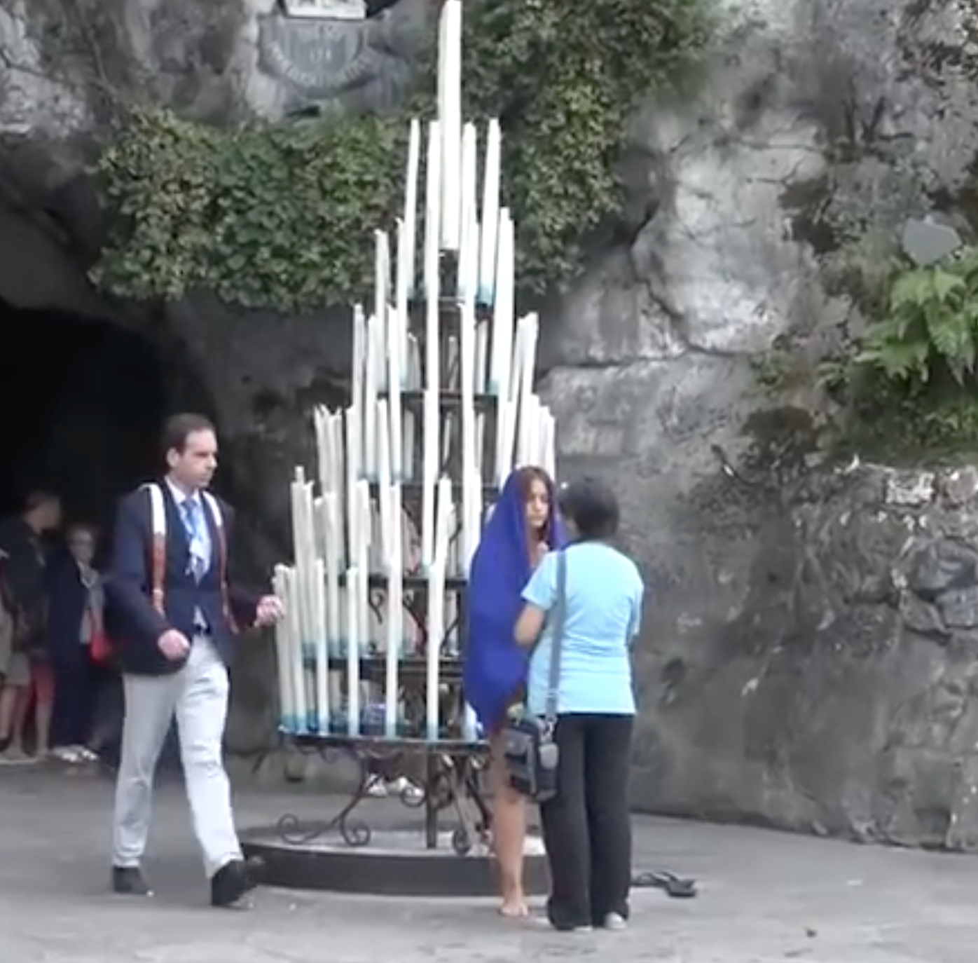 De Robertis’s intervention at the site comes at the height of tourist season in Lourdes. Footage shows the nude performance artist walking toward the sanctuary before briefly pausing with hands pressed together in prayer. Quickly, a tourist attempts to gently cover De Robertis’ breasts with the artist’s blue headdress before security guards rush in to apprehend the denuded woman.