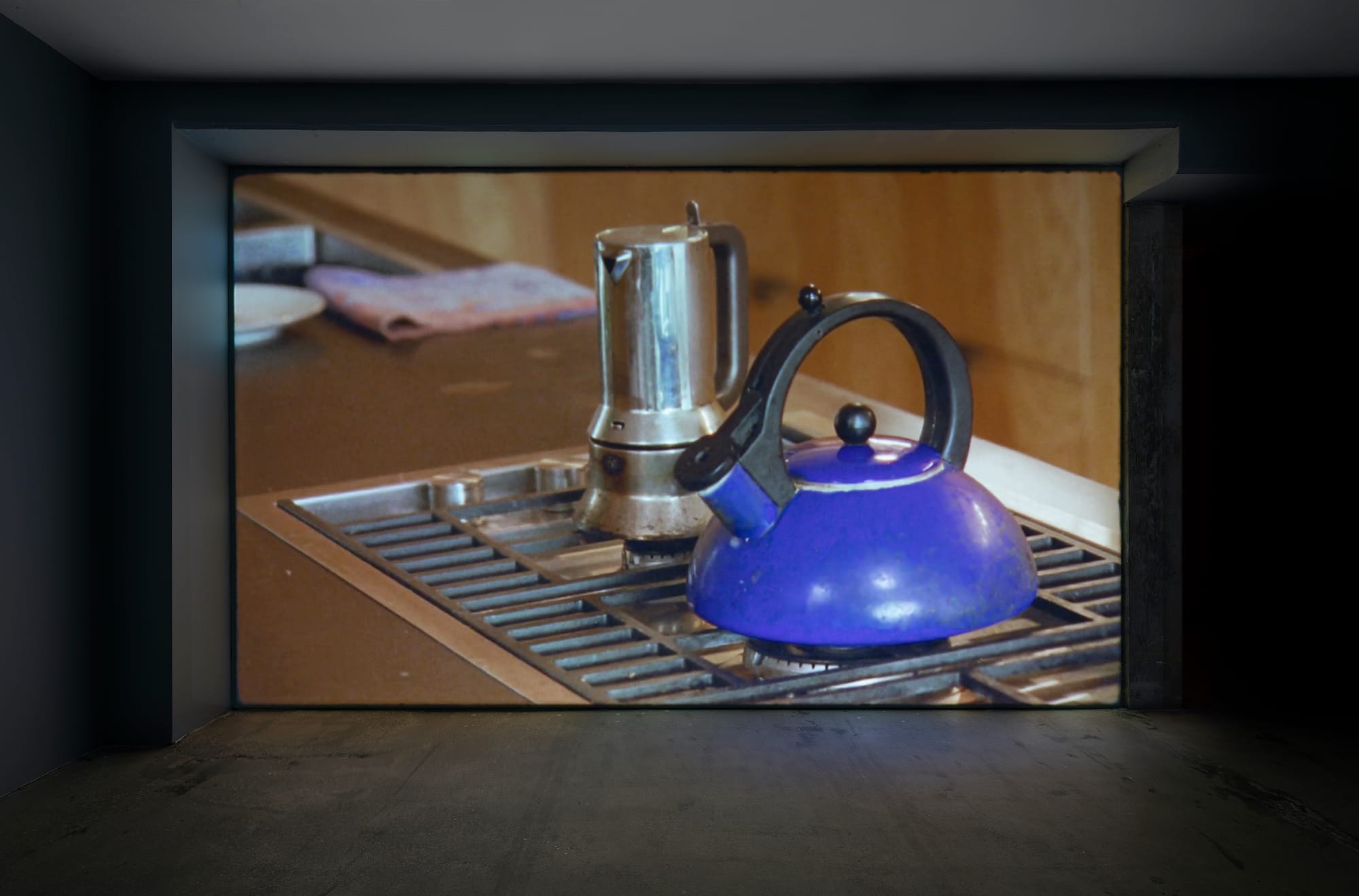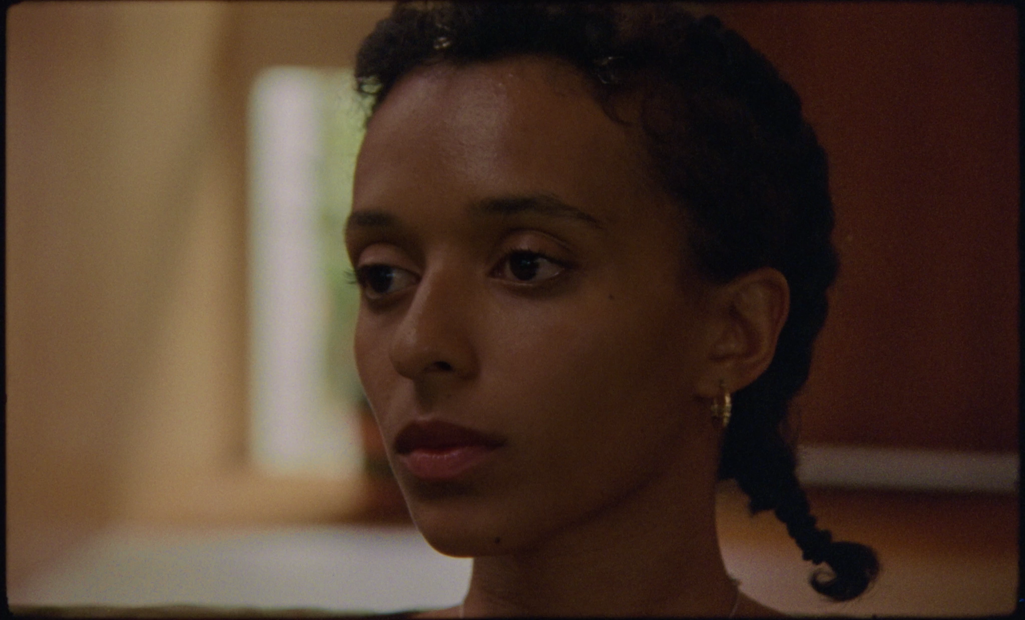Given the opportunity to pay such close attention to the minutiae of the everyday, a subtle, easily overlooked beauty in each visual element begins to emerge: The kettle is a pretty ultramarine, her brown skin is radiant in the film’s cool-toned color palette, and her balanced countenance makes her actions appear nearly meditative. She wears her curly hair in two braids. Metal hair clips, small gold hoop earrings, and a silver chain necklace, each minimal, decorative touches, add to the stunning vision of quietude.