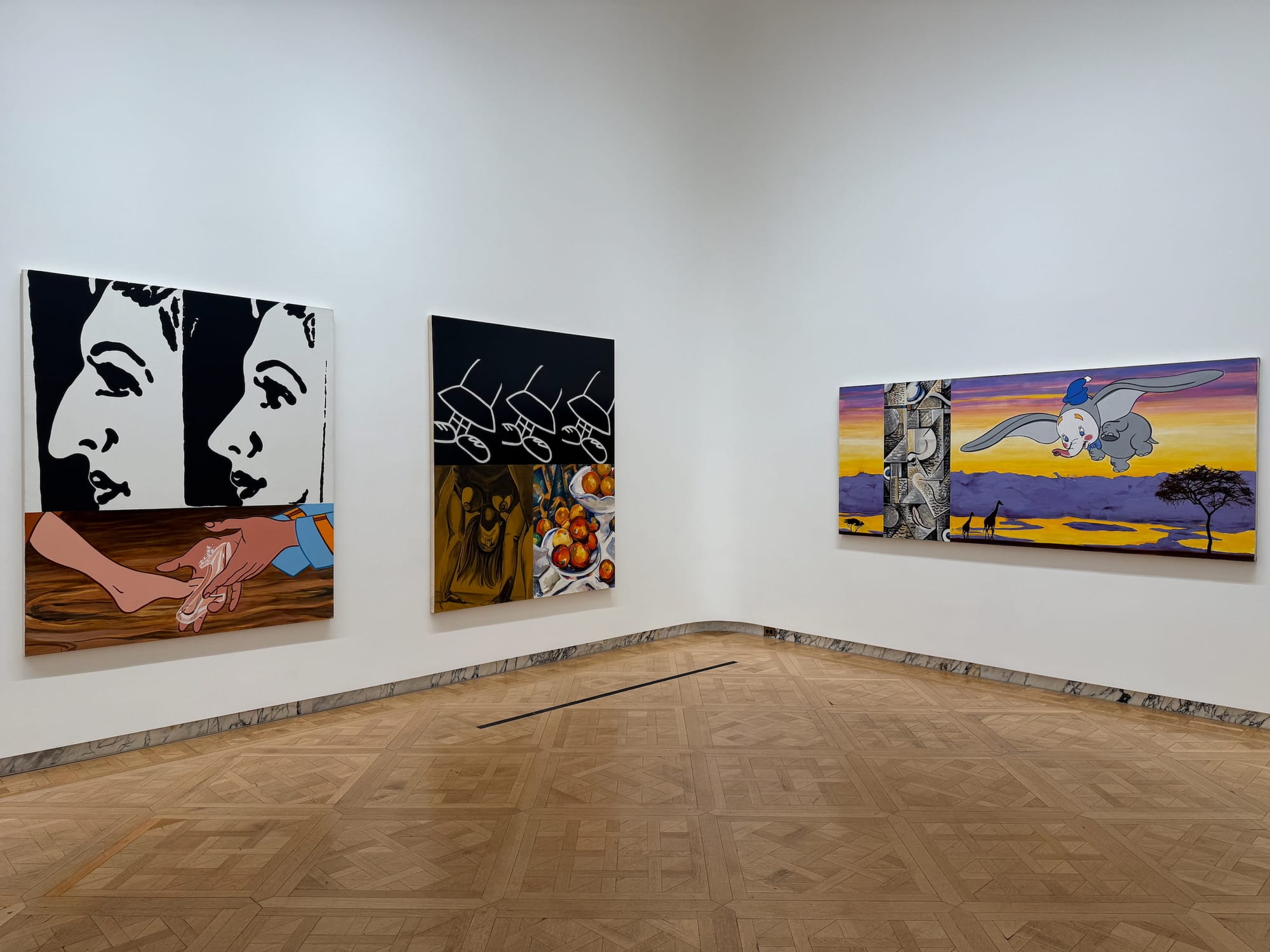 In “Untitled (First World, Third World)” (1990), the artist strikes at the Cold War language of the period, which placed the liberal democracies of the West against what we would call the Global South today. By combining a classic Cubist composition with an African landscape, Kass hints at Picasso's influences that propelled his own experimentation with space. In the same way, Disney, as represented by the Dumbo franchise, is transported to the African savannah — a symbolic act of return? — as opposed to Florida, where the big-eared fella’s story normally takes place. While the African heritage of the Cubist work is more obscured, the placement of the beloved cartoon elephant, adorned with full circus makeup, in what may appear to be a more traditionally suitable landscape looks absurd — never mind that Dumbo is an Asian elephant with amorphous African elephant features, including huge ears and being almost hairless. African influence has migrated in many directions, leaving the indirect progeny of that continent in a conceptual limbo on the African plains. The paths of influence remain invisible, but intuitively we see them. The depopulation of an African landscape flattens the place into a silhouetted sunset scene in contrast to the spatial innovations of Cubism and the more articulated flying elephant — all of which mine Africa for different purposes.