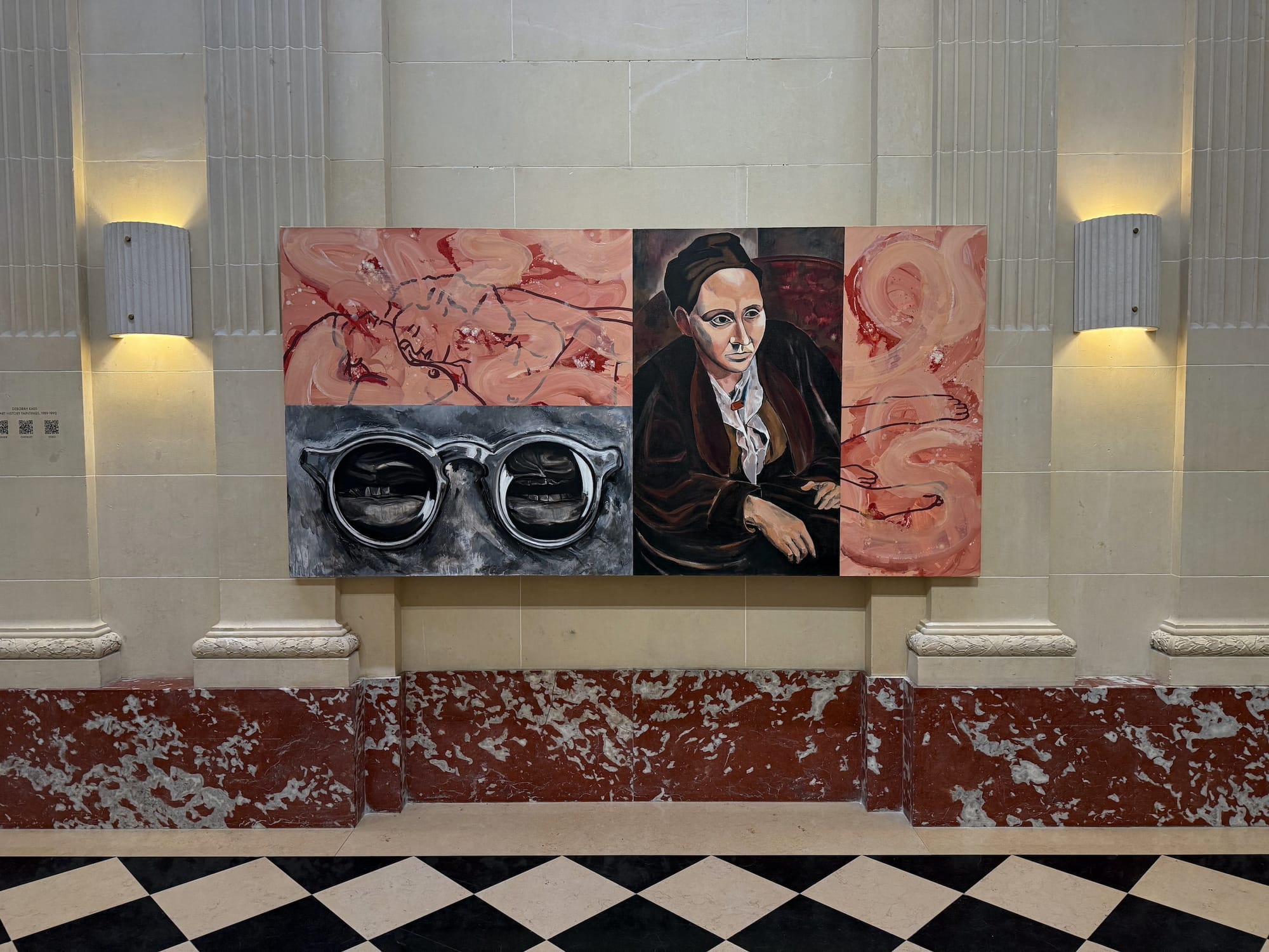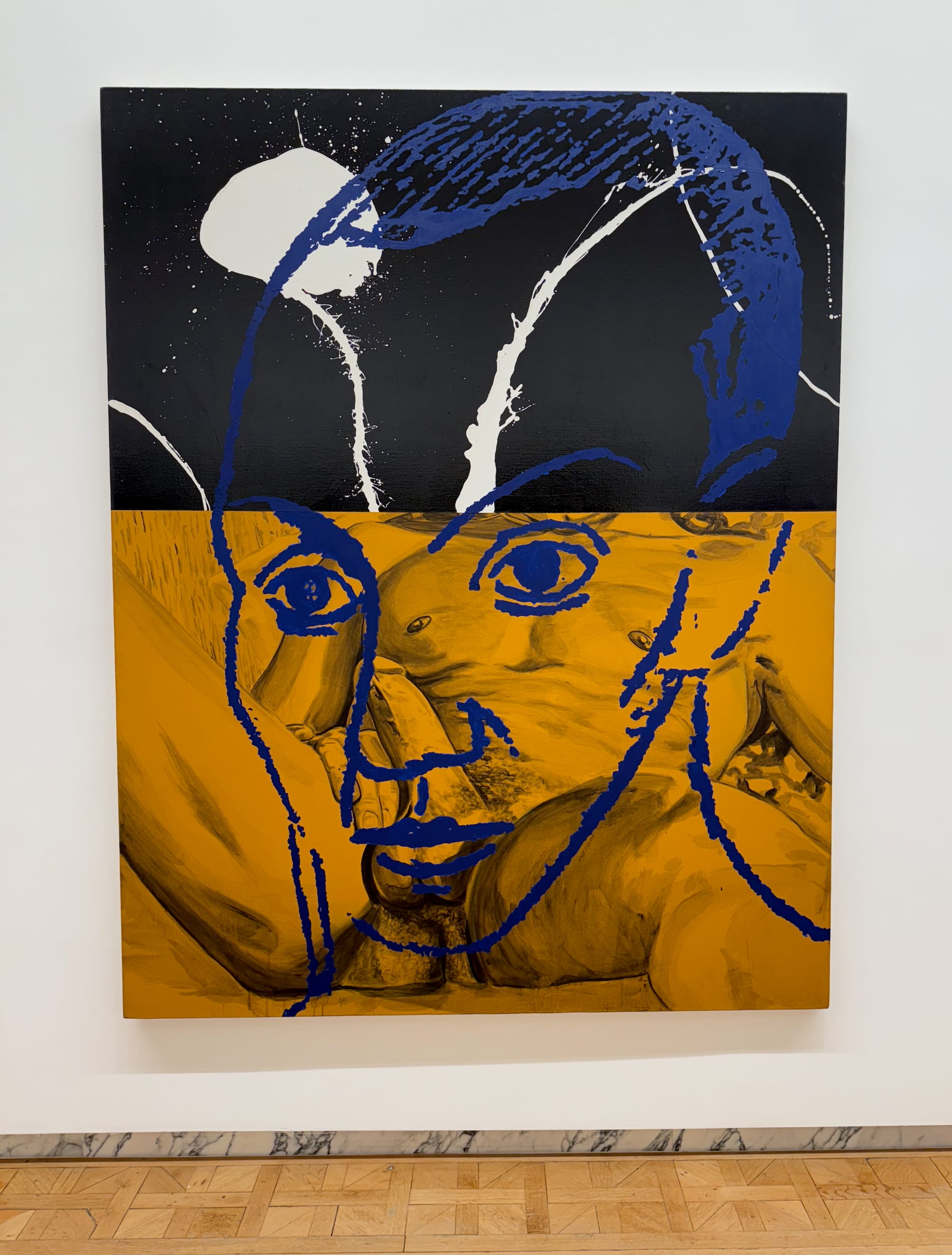 Kass’s work is most pointed when she focuses on lesbian or queer identity. Two of some of the most famous images of lesbians in Modern art are combined with a more fluid, all-over abstract style in “How Do I Look” (1991), along with Jasper Johns’s “The Critic Sees” (1961), in which Johns swaps a critic’s bespectacled eyes with mouths. The coital French women are drawn atop rosy swirls, as a serious Gertrude Stein looks out from her Picasso-painted portrait. Everything is rendered in high contrast, and the austere public persona of the Jewish-American intellectual dominates the portrayal of same-sex love. While Stein was openly lesbian at a time when prohibitions against being out existed, Johns has always been more coy about his own sexuality, even decades after Stein’s death. It also brings up the question: When we walk through a museum, do we even recognize queerness? This portrait of lesbian passion was painted by a straight man, yet it is the most identifiably LGBTQ+ image for the visitor. "Are we actually looking?" Kass asks, or, like Johns’s slam against critics, are we unable to see while we continue to speak?