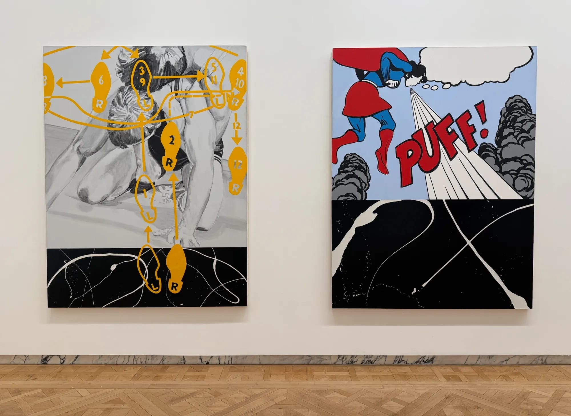 “Puff Piece” (1991) pairs a black-and-white, Pollockesque splash with Superwoman or Supergirl (I’m not sure which) who blows a stream of air at the semen-like splurt. The whole series plays with David Salle’s well-known postmodernist painting series from the 1980s in which he juxtaposed images that we normally don’t associate with one another. In doing so, Kass collides the stylistic calling cards of prominent male artists with a new, more sexualized reading that turns splashes of paint into cum shots. She instills the painting with a more frank and illuminating sensibility, unlike Salle’s shadowy energy, that almost always ends up feeling like we just walked into the latter’s therapy appointment.