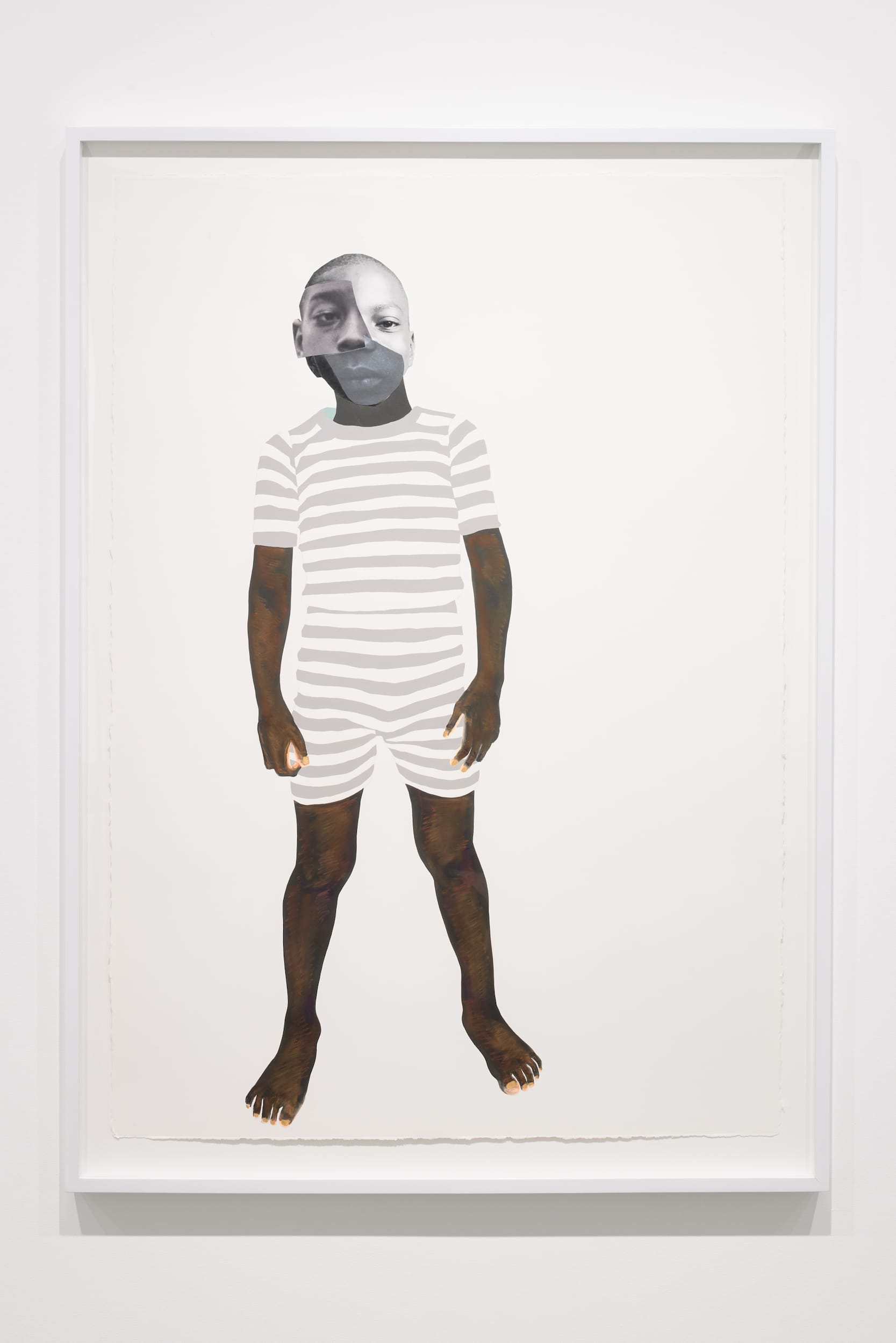 The works in the show are suffused with care, as Roberts centers the children’s beauty and vulnerability, which is often seized from them at a young age via systemic violence in the United States. In tandem with their innocence, the artist provides clues about the sinister conditions of their lives through her layering of found images with hand-drawn and painted details. In “Armor”(2018), she depicts two young boys. One boy’s face is seen in two parts — as a youth and a man. The other young boy seems to be playing, yet his hands have been replaced with collaged photographs of adult hands, signifying the treatment of Black children as adults by a system that continually perpetuates racial profiling and criminalization.