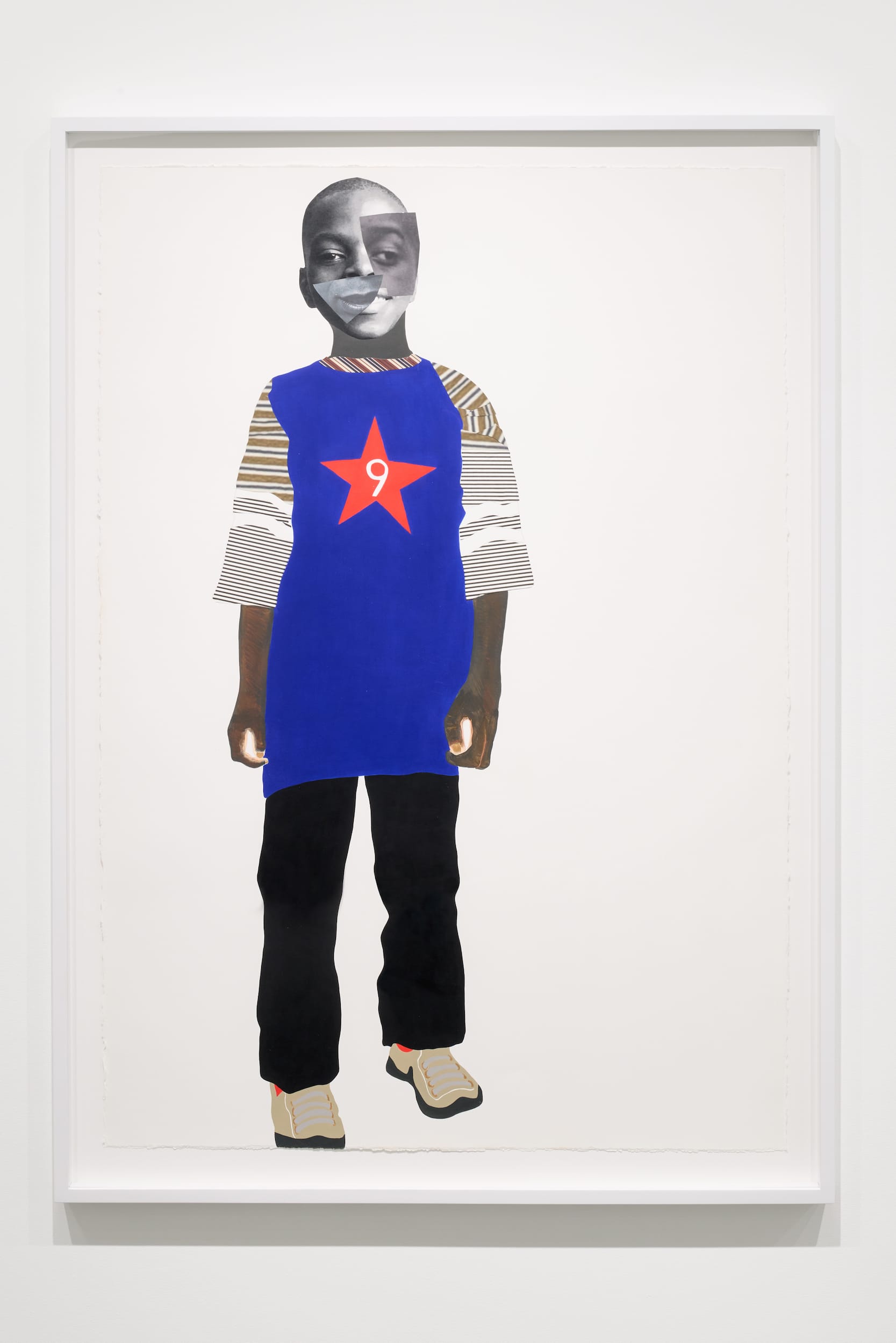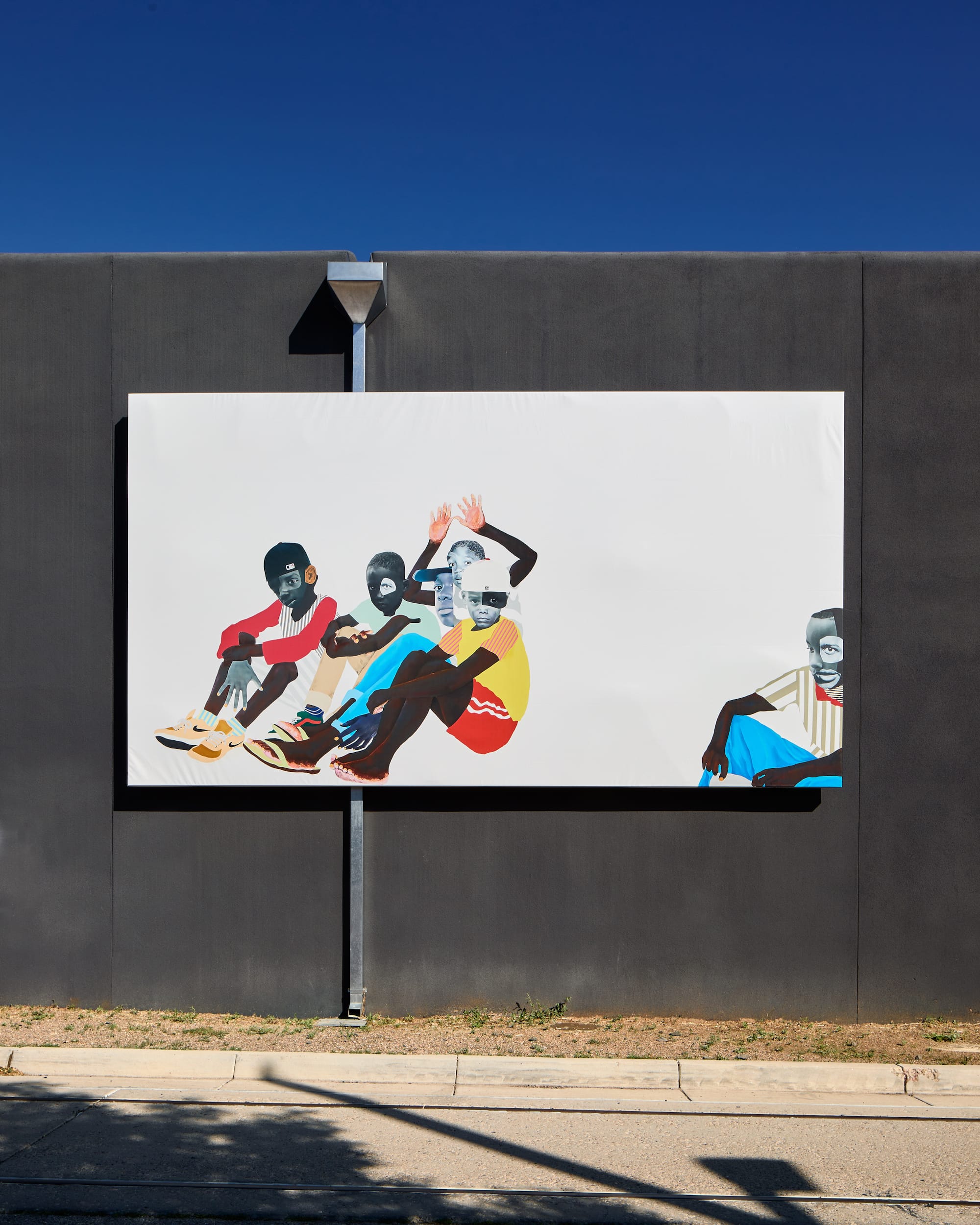 SANTA FE — Deborah Roberts: Come walk in my shoes, currently on view at SITE Santa Fe, is a small powerhouse of a show. The Austin-based artist’s first solo exhibition in New Mexico features 15 large-scale collages and paintings and one sculpture, while monumental billboards activate the museum’s exterior spaces. Roberts is well known for her representations of girlhood that focus on Black girls and subvert White, Eurocentric conventions of ideal beauty. In these works, the artist refuses the fallacy of universal beauty and makes space for women of color. In Come walk in my shoes, she turns her attention to Black boys, creating thoughtful tableaus of childhood and the robbery of innocence at the hand of the government, carceral system, and broader systemic racism in the United States.