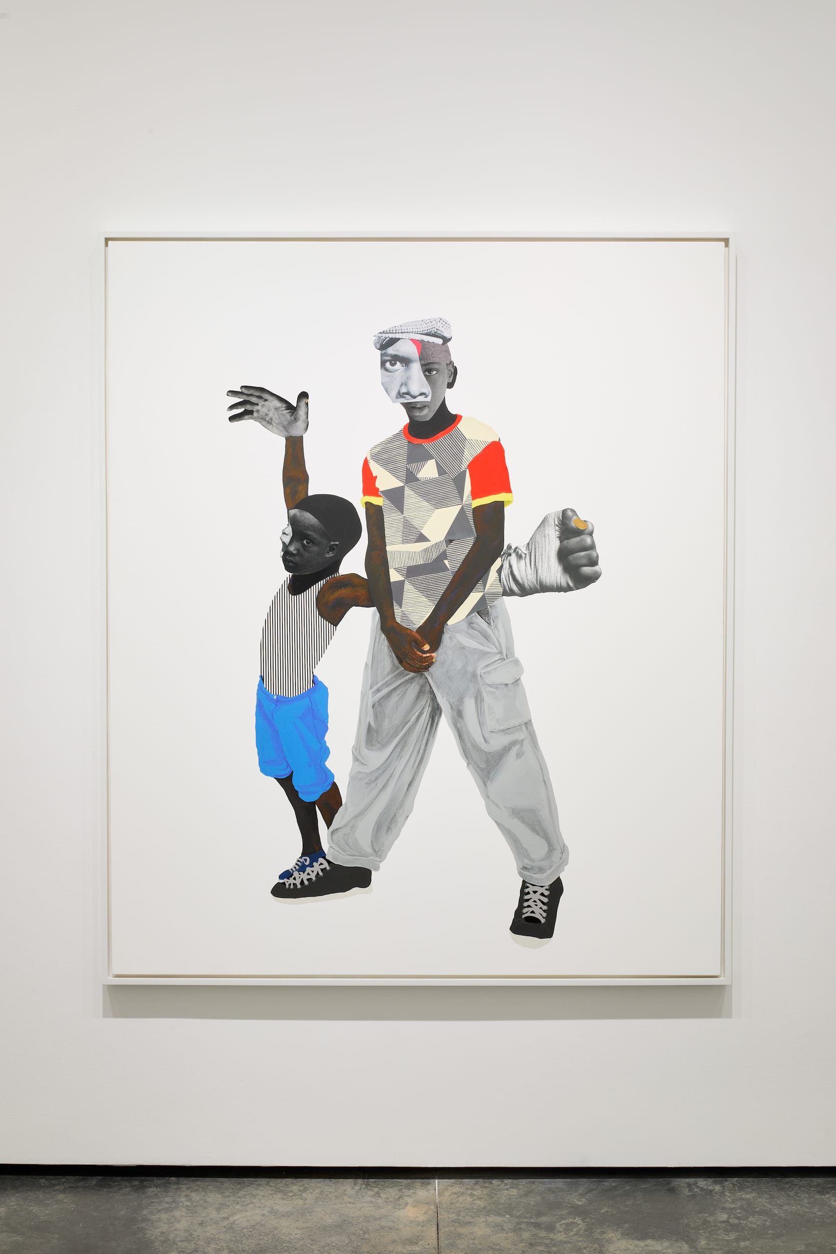 The works in the show are suffused with care, as Roberts centers the children’s beauty and vulnerability, which is often seized from them at a young age via systemic violence in the United States. In tandem with their innocence, the artist provides clues about the sinister conditions of their lives through her layering of found images with hand-drawn and painted details. In “Armor”(2018), she depicts two young boys. One boy’s face is seen in two parts — as a youth and a man. The other young boy seems to be playing, yet his hands have been replaced with collaged photographs of adult hands, signifying the treatment of Black children as adults by a system that continually perpetuates racial profiling and criminalization.