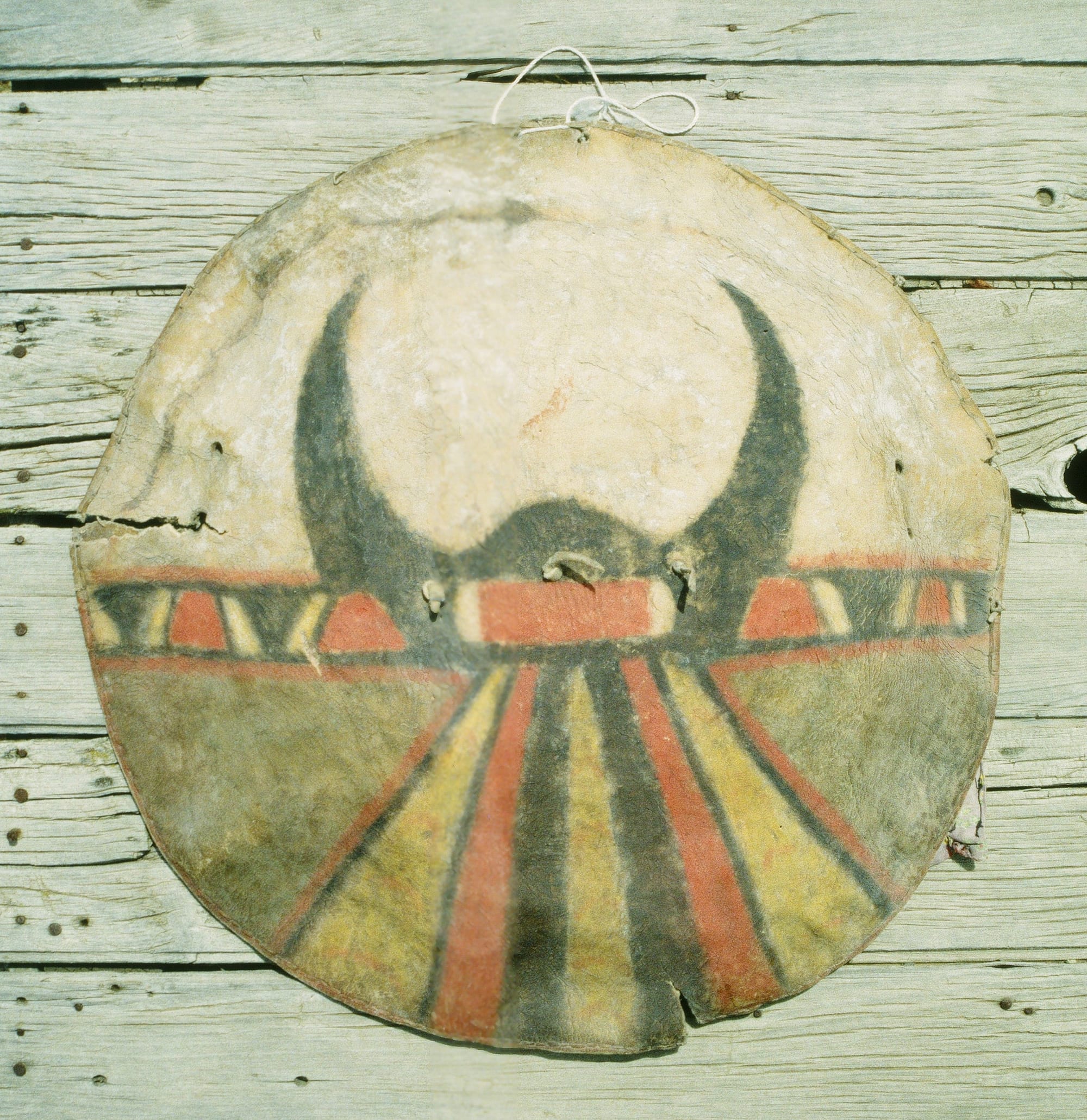 Next on their list is a buffalo hide war shield that features a central image of horns from which bands of red, yellow, and black radiate out. In March 2021, New York’s Donald Ellis Gallery posted a picture of a shield that the Pueblo said matches a photo of the item from Frank’s ledgers. In an Instagram caption, the gallery stated that the shield came from the Jemez Pueblo, not the Santa Ana Pueblo, and that the work was “acquired by a Canadian private collector.”