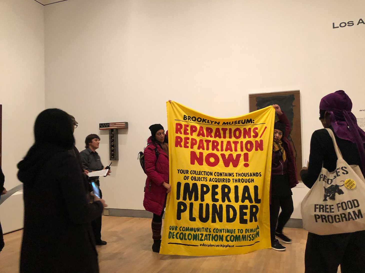 Amin returned from his discussion with visitor services just as they were being asked to fold up their banners once again. He told Hyperallergic that he met with two visitor services staff members, who, “communicated how they’re supportive and it’s an uncomfortable position.” He says they tried to contact Brooklyn Museum administration but were unable, instead forwarding them a letter from Decolonize This Place.