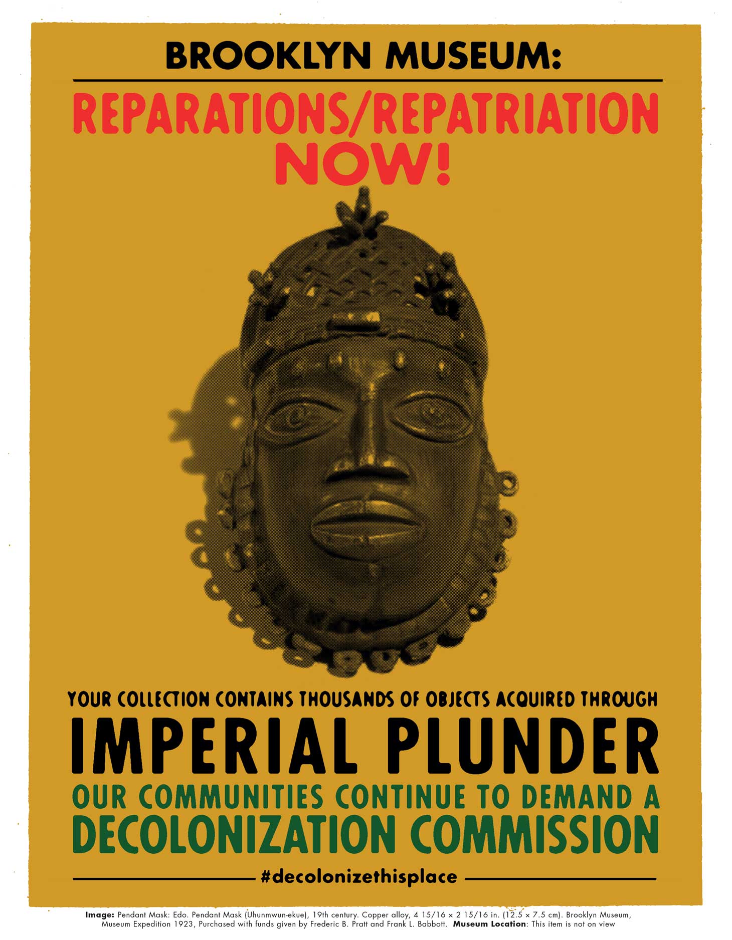 Today at the @brooklynmuseum, a reminder that we, along with 20 grassroots groups, stand ready to engage in dialogue on how to proceed in establishing a decolonization commission. A non-response is not an option. #decolonizethisplace pic.twitter.com/R5irn0MvIq
