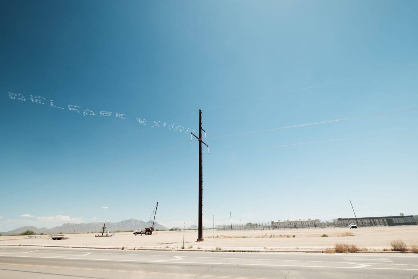 Organized by visual and performing artists Cassils and rafa esparza, In Plain Sight (IPS) enlisted skytyping plane fleets to spell out the texts in water vapor over 80 detention facilities, immigration courts, borders, former internment camps, and other notable sites. Each message was written by one of 80 participating artists and activists and ended with the hashtag #XMAP, leading viewers to the project’s website: a vast resource center including an interactive map that locates detention facilities in your vicinity; essential data and statistics on the migrant detention emergency; and a list of border funds and organizations in need of donations and volunteers.