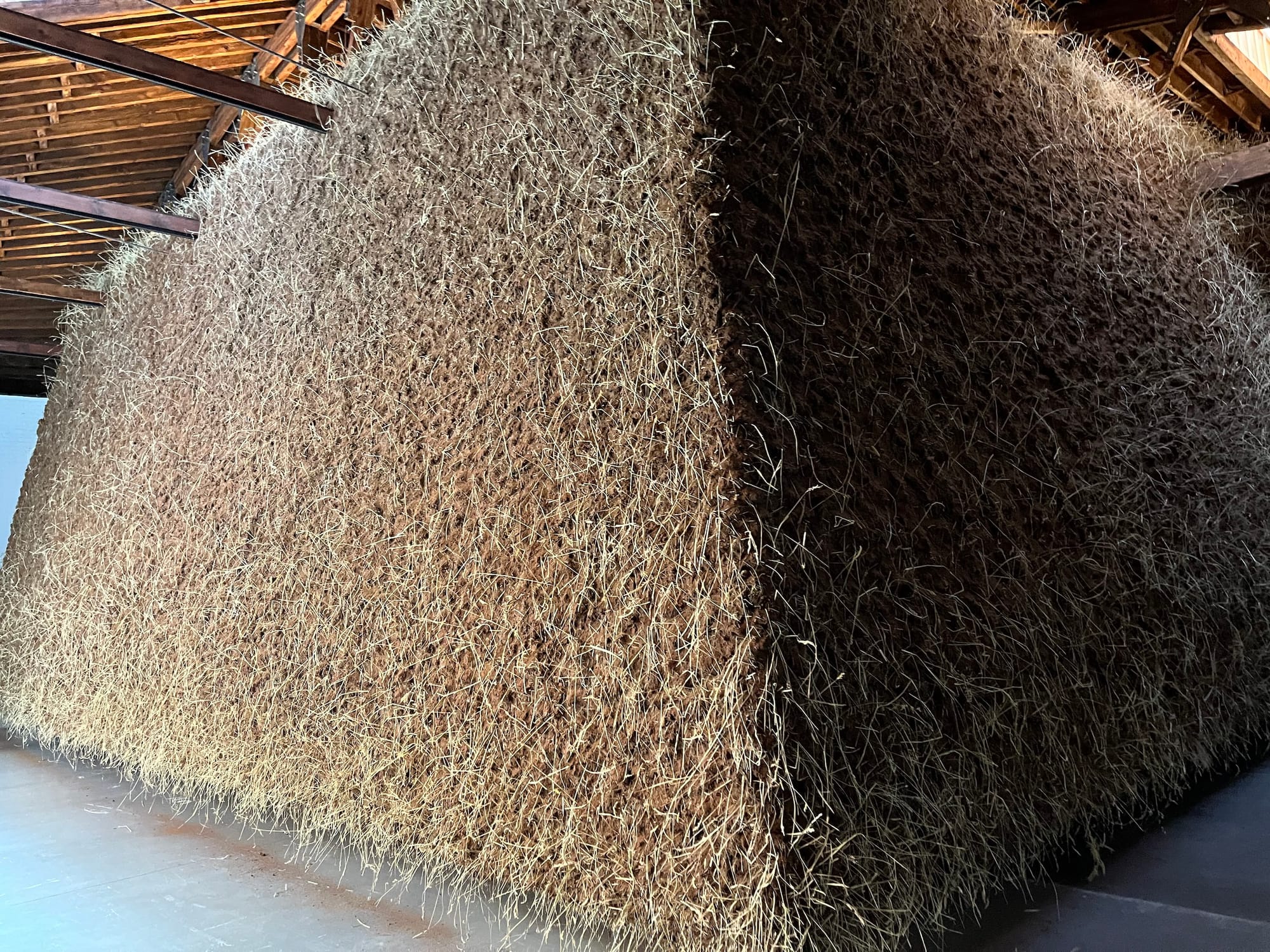That sense of perspective gets flipped as the visitor enters the second room. A hulking earthen monument (2023) that shares the exhibition’s title occupies most of the room. Its craggy soil walls, adorned with stubbly bits of hay, extend almost from floor to ceiling, maybe 20 or 25 feet in height, dwarfing the visitor. The bunker-like structure is suspended about a foot off the floor, as if it were levitating. On one of its four sides, a narrow passageway allows visitors to enter the structure partway, until engulfed by its mass. Similar to “Cielo terrenal,” “El abrazo” has an aura of reverential mystery, only in this case the mystery feels up close and personal.