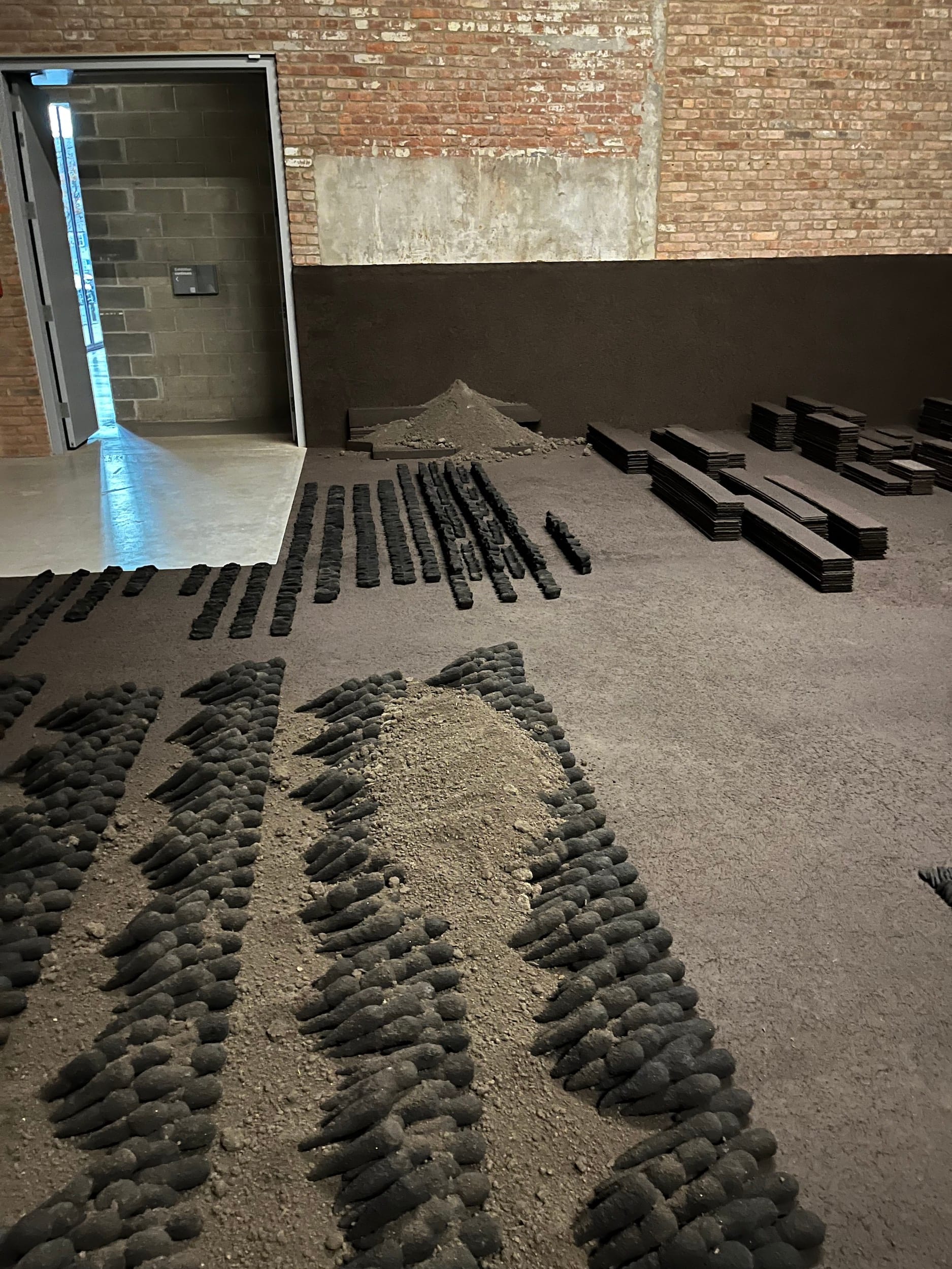 Morelos has written a brief, poem-like set of “Instructions” encouraging visitors to touch “El abrazo.” Both the instructions and the physical object foreground sensory experience. The artist has created a fragrance from cinnamon and clove and infused it into “El abrazo,” which fills its room with the scent of a nutty herbal tea. The artwork’s soil turns out to be surprisingly brittle for such an imposing, seemingly sturdy structure; when touched, it breaks off like crumbs from a cookie and accumulates on the floor. It will be interesting to see if the size or shape alters appreciably from being handled during the exhibition’s nine-month-long run.