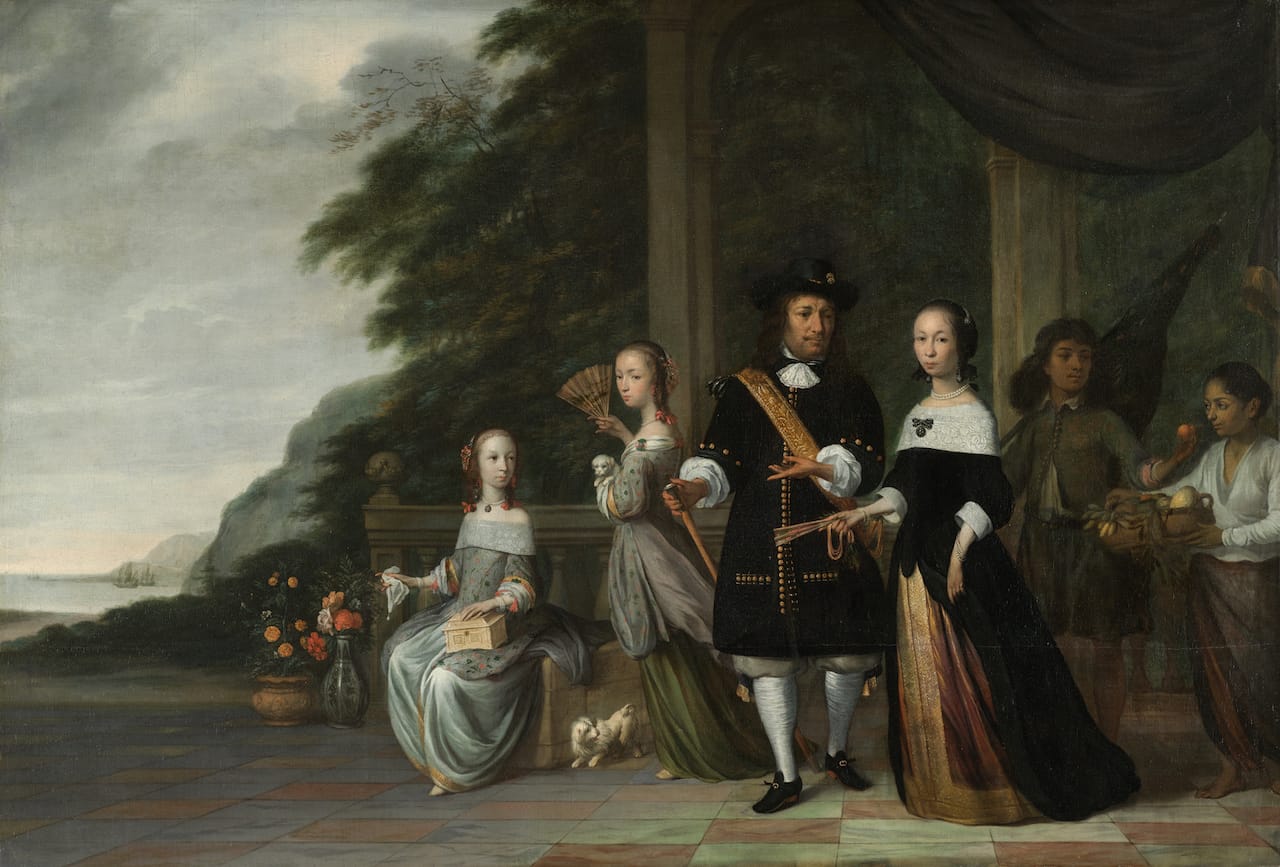 After all, the beauty of these objects is easy to see. What is less clear to the viewer is the human cost that extends beyond genocide for nutmeg (which is given a respectful airing in the show). For instance, one of the most striking images of the exhibition is an elegantly posed group portrait of a burgher family at a country home. This is hardly a novel subject, but closer inspection reveals that the mistress and children of the house are part Asian, and the servants in the wings are Indonesian slaves. In fact, while the family’s wealth was real, the stone porticoed house is fictional, as is the mountainous landscape that it overlooks. The woman is Cornelia van Nijenroode, the daughter of a VOC governor and a Japanese courtesan. When her father died, she was taken from her mother at the age of four to be raised Christian, in an orphanage.